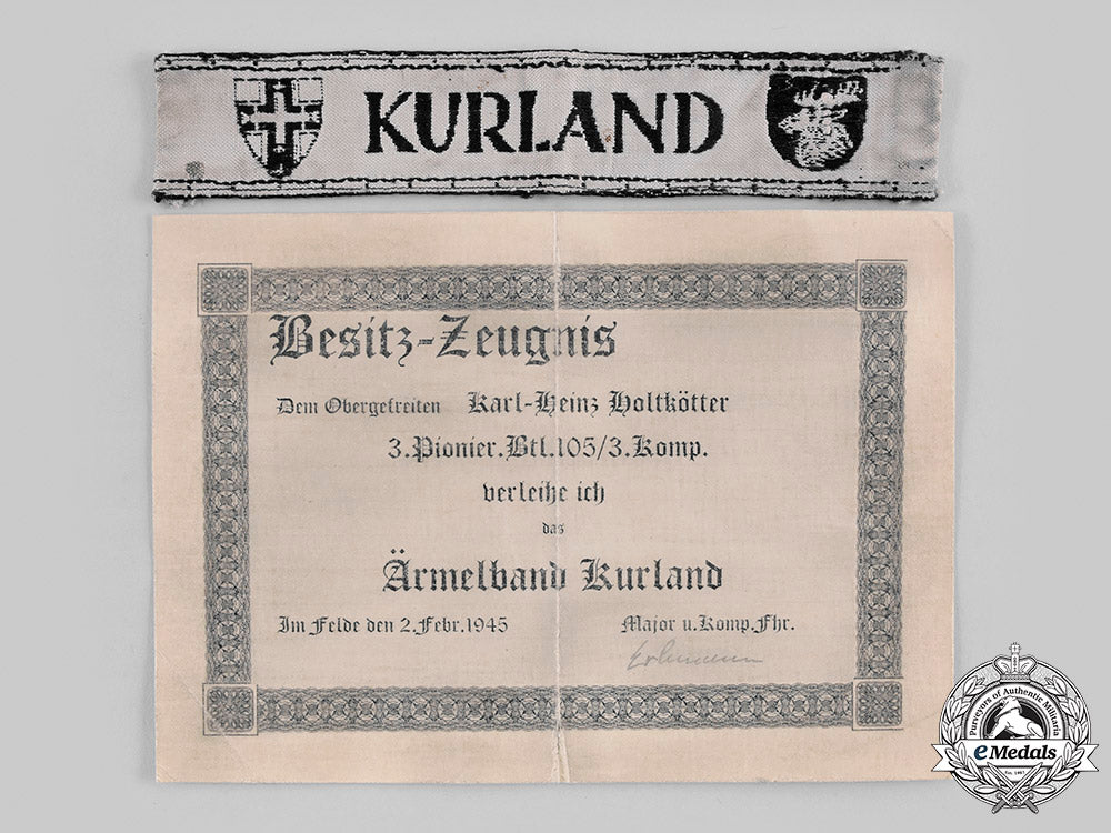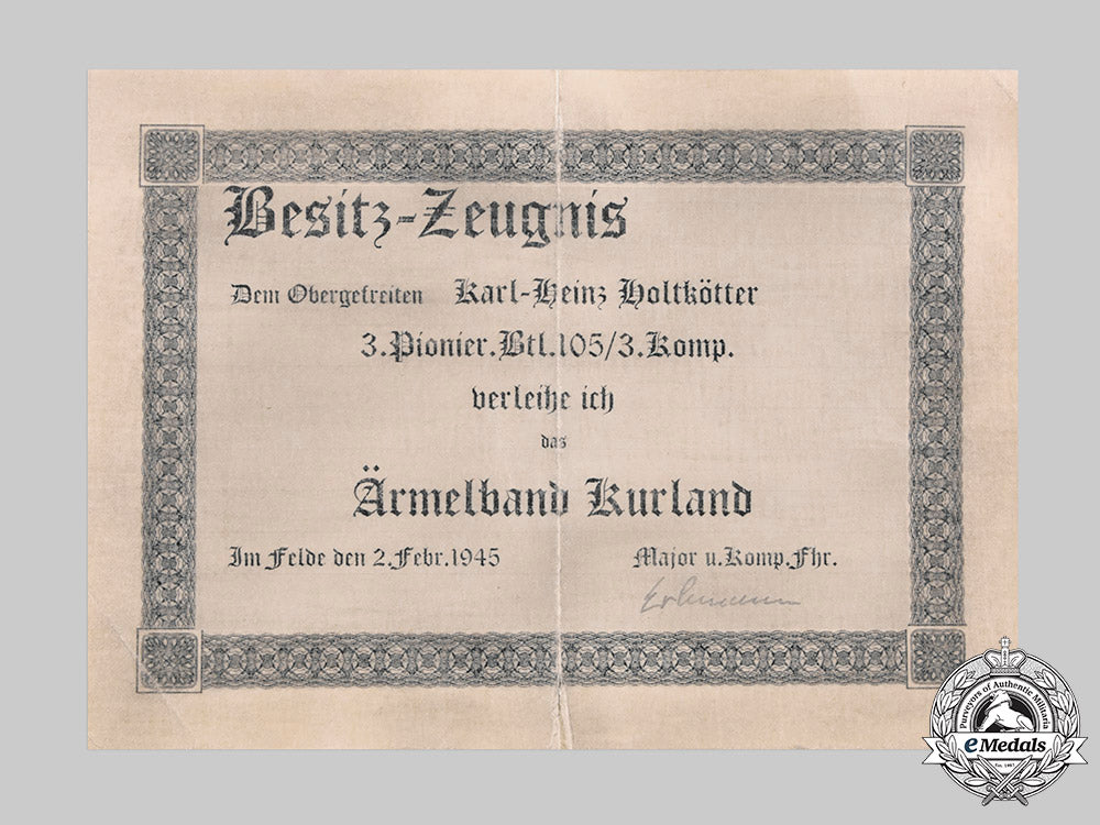Germany, Heer. A Kurland Cuff Title, With Award Document, To Karl-Heinz Holtkötter