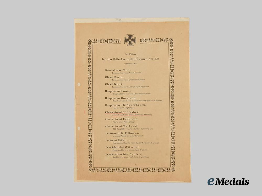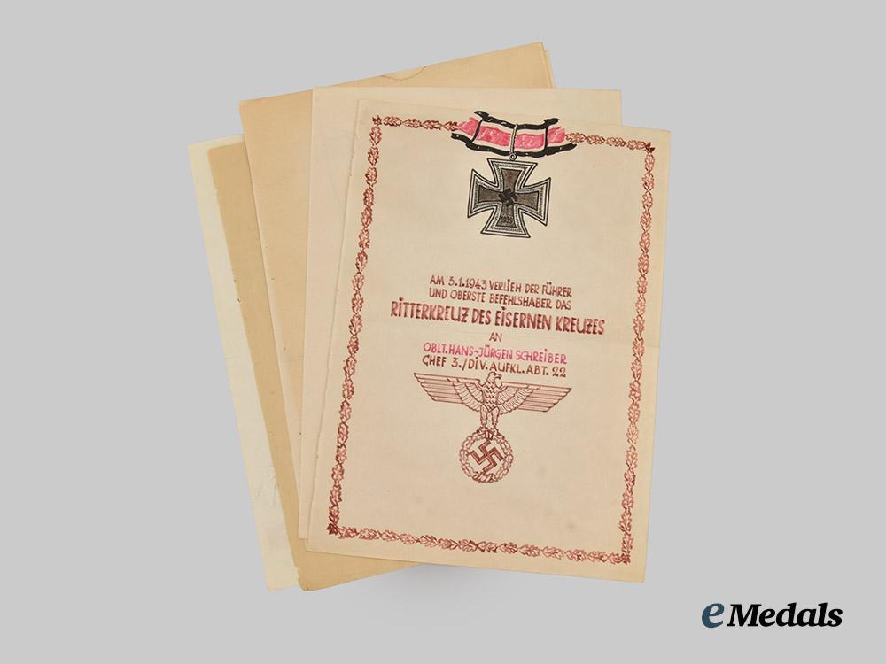 Germany, Heer. A Set of Commemorative Documents to Oberleutnant Hans-Jürgen Schreiber, Knight’s Cross of the Iron Cross