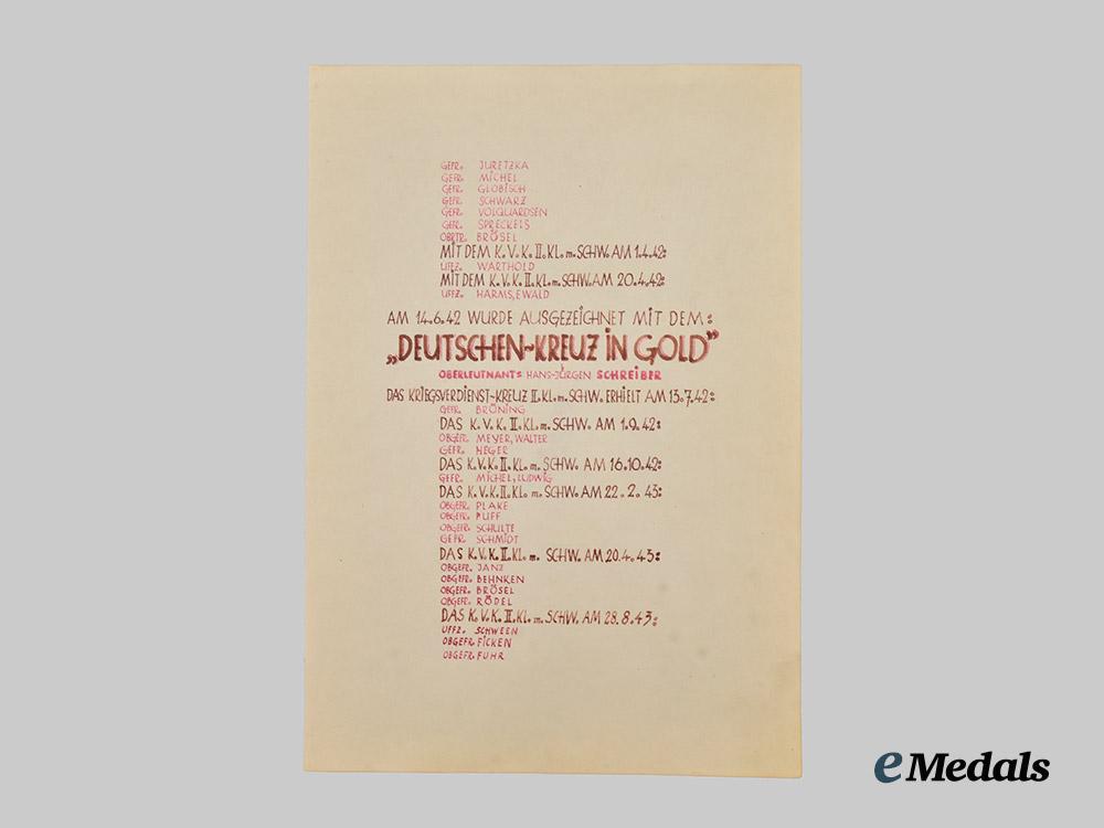 3. A handwritten list of recipients of decorations within the unit, presented in multi-coloured ink on off-white paper, with Schriber’s name highlighted in enlarged text as a recipient of the German Cross in Gold on 14 June 1942, measuring 20.5 cm (w) x 29.5 cm (h), in extremely fine condition.