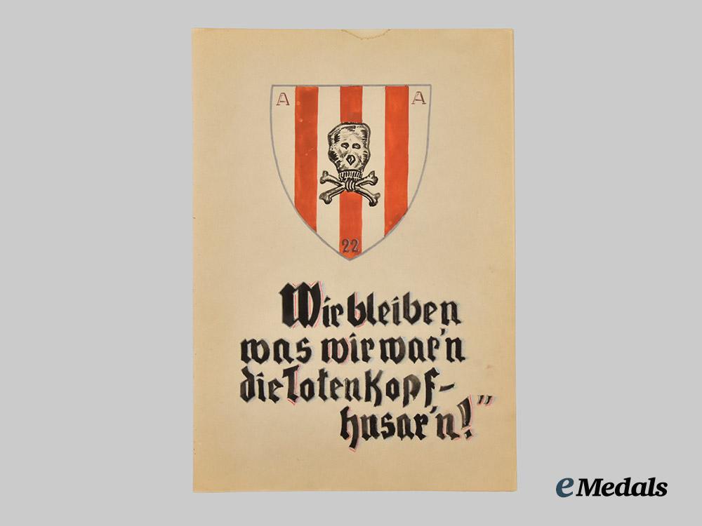 2. A hand-drawn emblem of Aufklärungs-Abteilung 22, presented in multi-coloured ink on off-white paper, above an inscription of “WIR BLEIBEN WAS WIR WAR’N, DIE TOTENKOPF-HUSAR’N!” (“WE REMAIN WHAT WE WERE, THE DEATH'S HEAD HUSSARS!”), measuring 20.5 cm (w) x 29.5 cm (h), in extremely fine condition.
