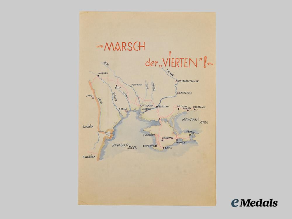 1. A hand-drawn map chronicling the Crimean campaign, presented in multi-coloured ink on off-white paper, topped by an inscription of “MARSCH DER ‘VIERTEN’!” (“MARCH OF THE FOURTH!”), measuring 21 cm (w) x 29.5 cm (h), in extremely fine condition.