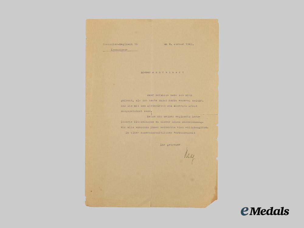 5. A typewritten letter, dated 8 January 1943 and issued by the Commander of Grenadier-Regiment 16, expressing congratulations and best wishes to Schreiber for receiving the Knight’s Cross, closing with a handwritten signature, measuring 20.5 cm (w) x 29.5 cm (h), demonstrating some creasing and tearing to the edges, in very fine condition.