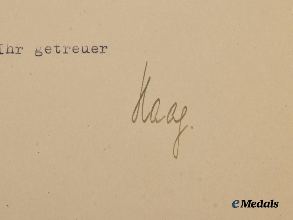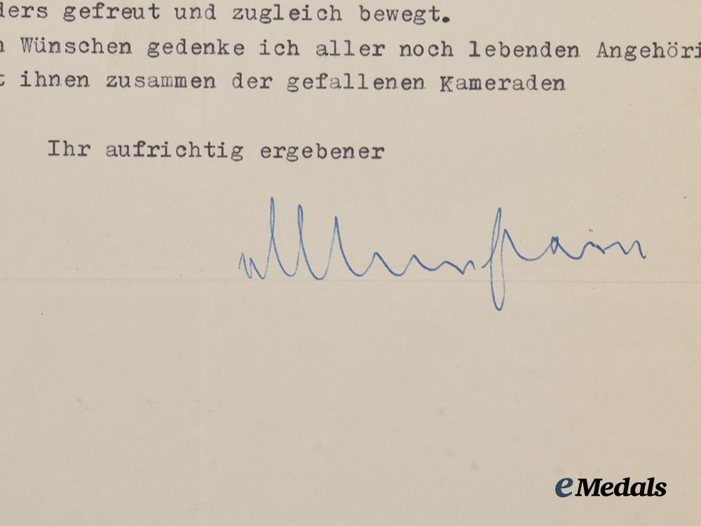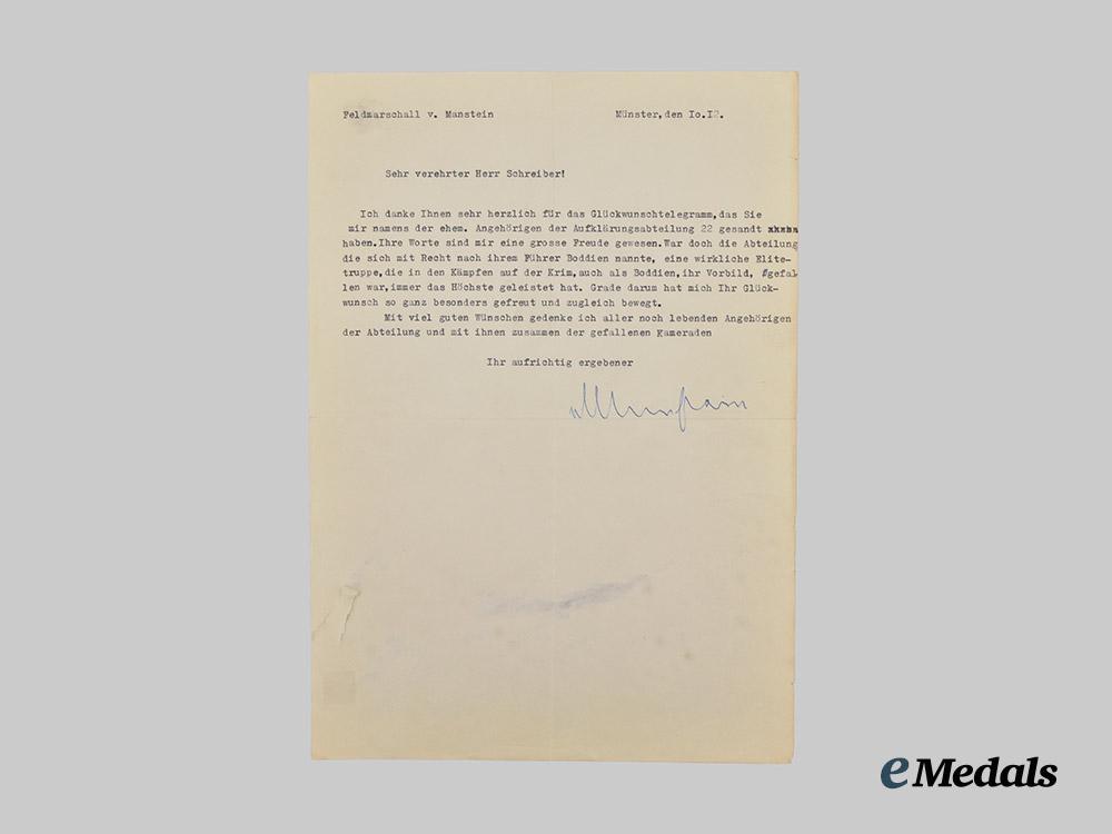5. A post-war typewritten letter to Schreiber from Feldmarschall Erich von Manstein, issued from Münster and date 10 December in an unspecified year, expressing gratitude to Schreiber for an unspecified telegram which he submitted to von Manstein on behalf of the surviving members of Aufklärungs-Abteilung 22, with the Feldmarschall going on to express his admiration of the unit and extending his best wishes for both living and fallen comrades, closing with von Manstein’s handwritten signature in blue ink, measuring 20.5 cm (w) x 29.5 cm (h), demonstrating some creasing and discolouration, in better than very fine condition.
