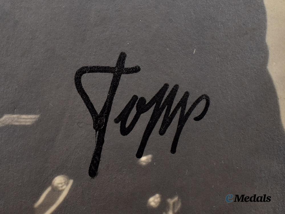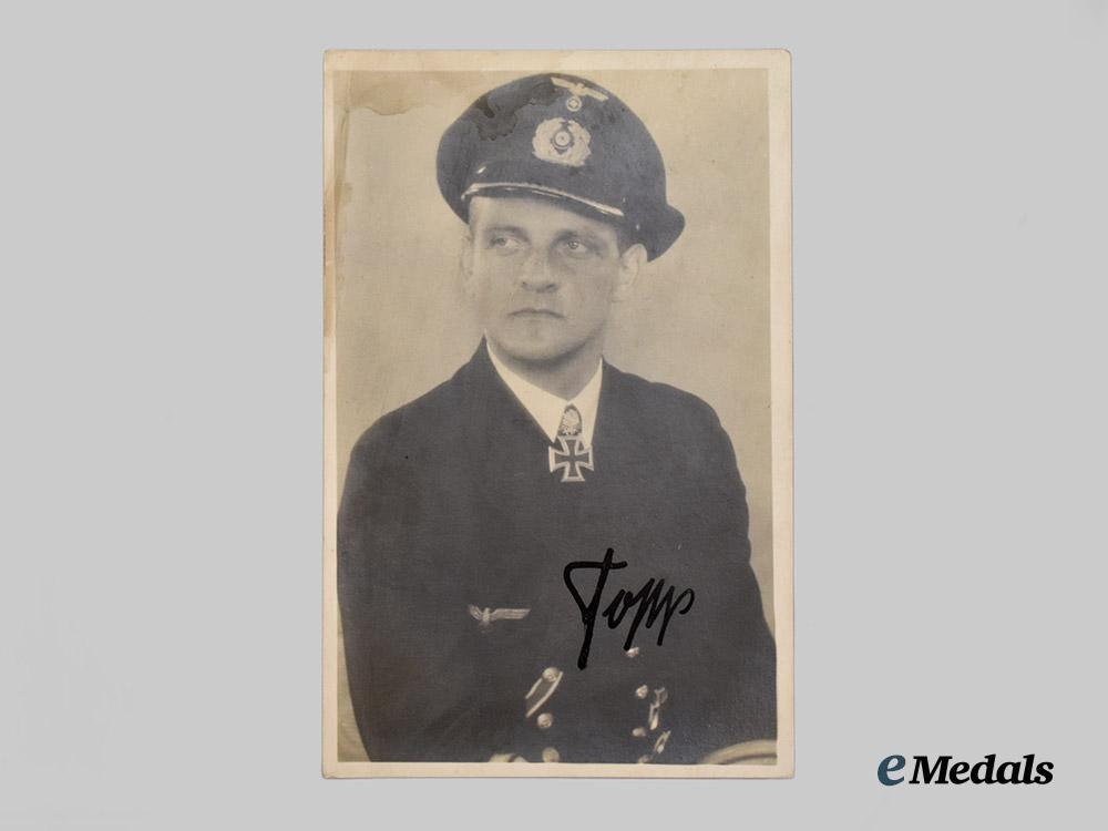 6. A signed postcard depiction U-Boat ace Fregattenkapitän Erich Topp (Knight’s Cross of the Iron Cross, 20 June 1941; with Oak Leaves, 11 April 1942; and Swords, 17 August 1942), in uniform and with the lower half bearing Topp’s handwritten signature in black ink, the reverse unused, measuring 90 mm (w) x 140 mm (h), in near extremely fine condition.