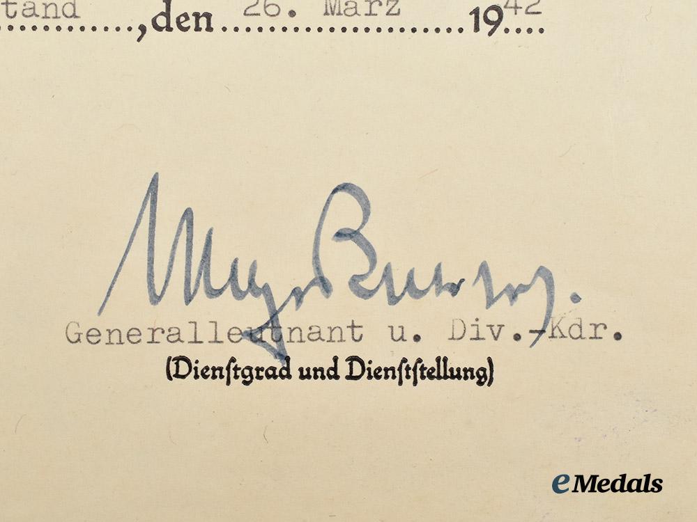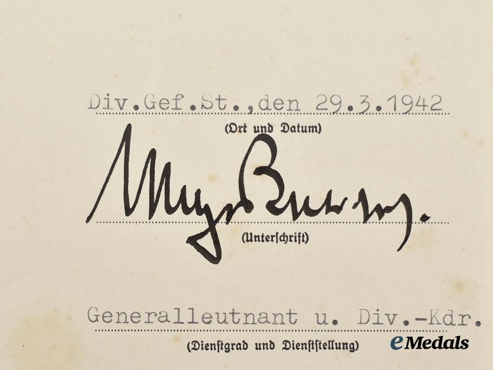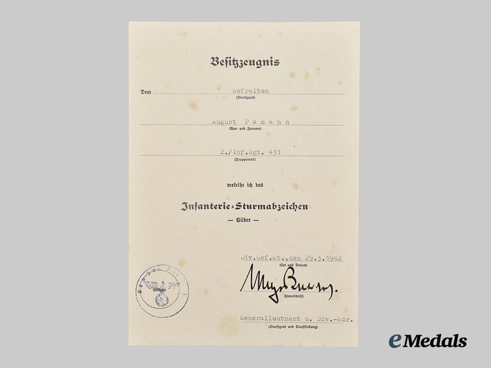 2. An award document for an Infantry Assault Badge, Silver Grade, constructed of off-white paper with black ink, named to Pamann as a Gefreiter of 2. Kompanie, Infanterie-Regiment 431, issued at headquarters on 29 March 1942, featuring the handwritten signature of Generalleutnant Heinrich Meyer-Bürdorff, measuring 150 mm (w) x 208 mm (h), in near extremely fine condition.