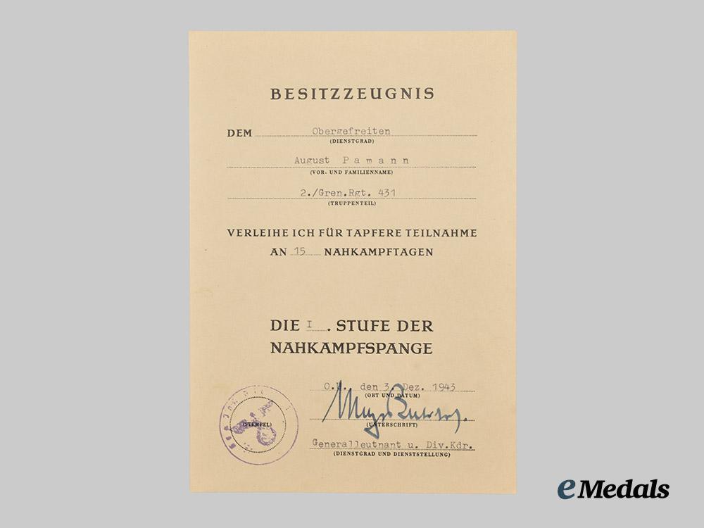 4. An award document for a Close Combat Clasp, Bronze Grade, constructed of off-white paper stock with black ink, named to Pamannn as an Obergefreiter of 2. Kompanie, Grenadier-Regiment 431, issued for 15 days of close combat, issued at headquarters on 3 December 1943, featuring the handwritten signature of Generalleutnant Heinrich Meyer-Bürdorff, measuring 141 mm (w) x 200 mm (h), in extremely fine condition.