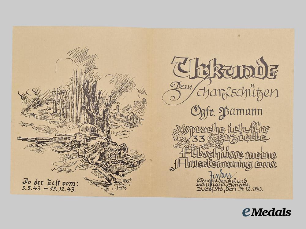 5. A customized congratulatory card, constructed of off-white card stock with black ink, opening to reveal a detailed pen and ink illustration of a Heer sniper in position in a first, above am inscription of “IN DER ZEIT VOM: 3. 5. 43. - 13. 12. 43.” (“IN THE TIME FROM 3 MAY 1943 UNTIL 13 DECEMBER 1943”), with the opposite side bearing a dedication to Pamann as an Obergefreiter in recognition of achieving 33 kills in the field, featuring the handwritten signature of General der Infanterie Hans Jordan (Knight’s Cross of the Iron Cross, 5 June 1940; with Oak Leaves, 16 January 1942; and Swords, 20 April 1944), measuring 185 mm (w) x 220 mm (h), in extremely fine condition.