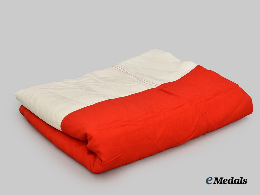(HJ Fahne). A massive and exceptionally well-preserved HJ banner flag, constructed of multiple panels of red and white cotton/rayon blended cloth, the hoist edge featuring a hollow channel for suspension, overlaid by double-sided central white cotton diamonds measuring 122 cm (w) x 122 cm (h), each bearing dyed black mobile swastikas, unmarked, measuring 150 cm (w) x 900 cm (h), demonstrating only minor and sporadic soiling, in extremely fine condition.