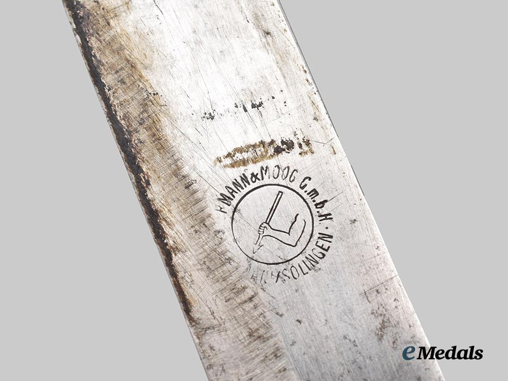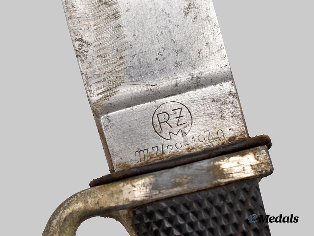 (HJ Fahrtenmesser). An HJ member’s knife, measuring 25 cm in total length when inserted into the scabbard. It features a 14 cm-long, nickel-plated, magnetic steel blade which retains some factory-original sharpening to the tip and lower edge. The reverse of the blade bears a partially-visible maker’s mark for the firm of Klittermann & Moog, Haan bei Solingen, while the ricasso is marked with a Reichszeugmeisterei (RZM) logo and code “M7/29” for the same manufacturer. The blade sits securely within a nickel-plated non-magnetic metal alloy hilt which features a hooked quillon and pommel, and which retains an intact black leather buffer pad. Two pieces of pebbled black bakelite compose the handle grip, and are fastened in place with dual non-magnetic metal rivets. Inset into the obverse of the handle is an enameled HJ insignia measuring 15 mm (w) x 25 mm (l). Accompanying the knife is its original scabbard, constructed of a blackened magnetic metal shaft. A black leather strap is riveted to the reverse, and fastened into a loop for belt suspension. The throat retains a functional spring catch to firmly hold the knife in place during storage. Significant issues consistent with age and period use are evident, and include running marks and oxidation to the blade (with evidence of cleaning and polishing which has compromised both the nickel plating and the inscriptions), loss of nickel plating to the hilt resulting in oxidation, loosening of the overall structure of the knife, loss of finish throughout the scabbard resulting in oxidation, and material fatigue to the strap. This transitional knife remains in a fair condition.