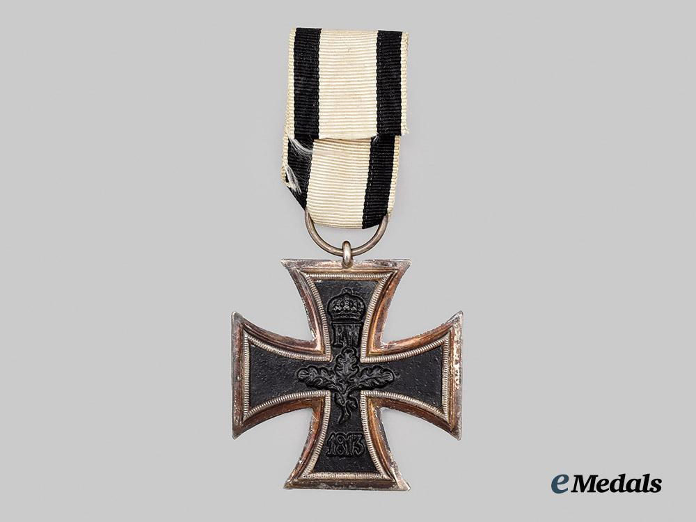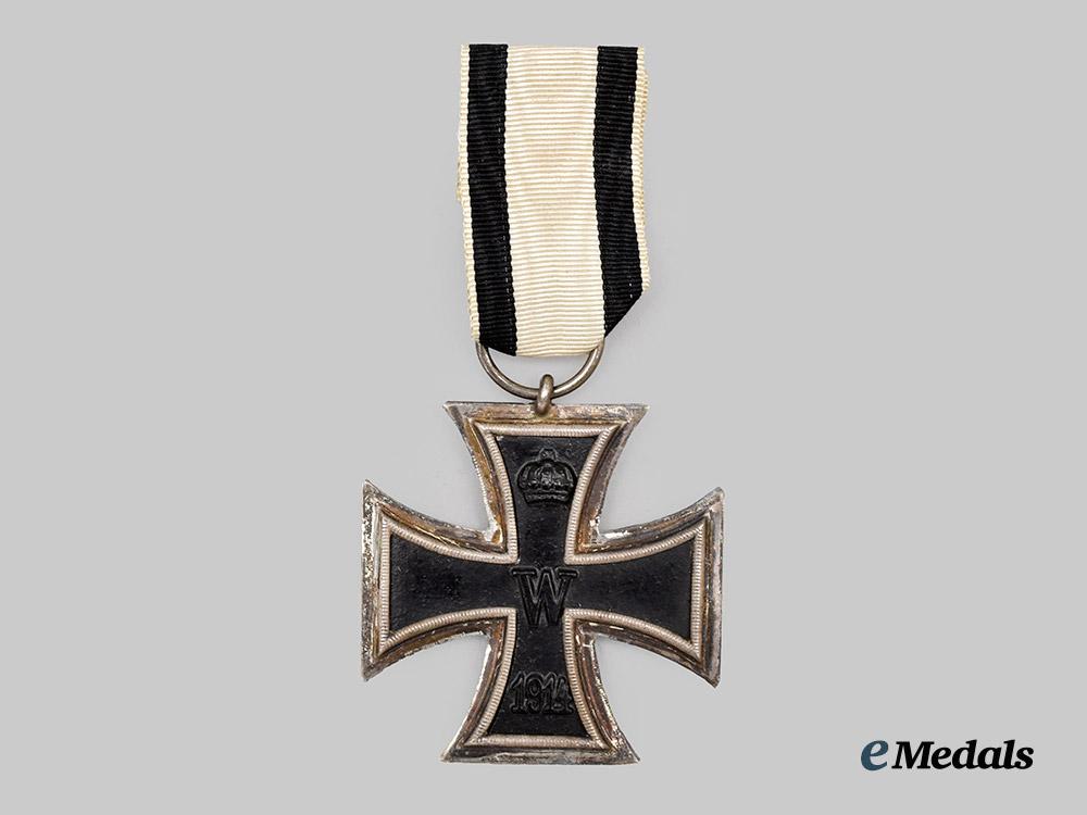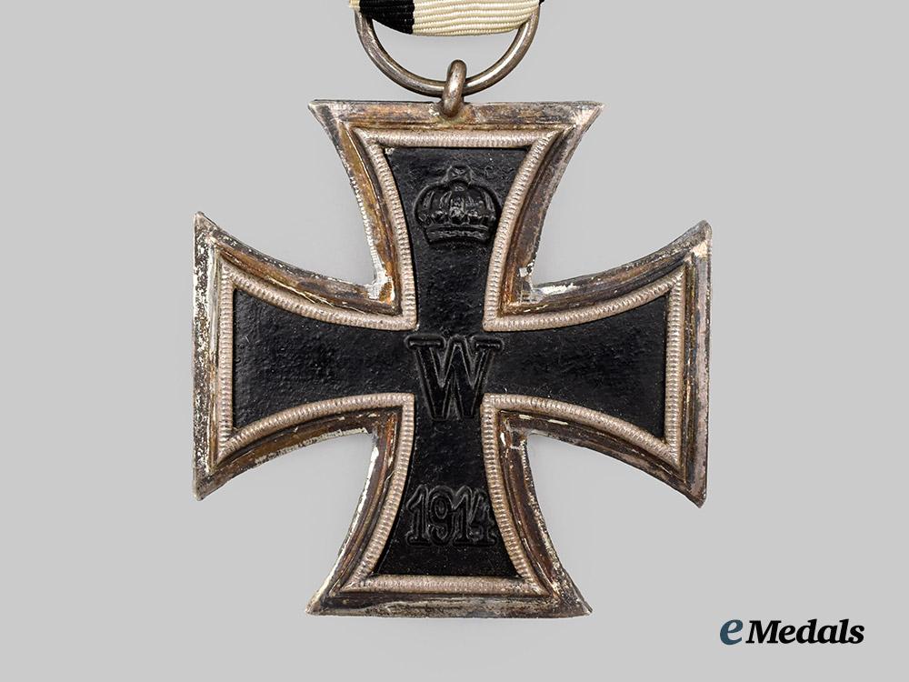 (Eisernes Kreuz 1914 II. Klasse für Nichtkämpfer). Reinstituted 5 August 1914 by Kaiser Wilhelm II. (1914-1918 issue). Constructed of iron and silver, on loop for suspension from a Third Reich-period non-combatant’s ribbon, consisting of a Cross Pattée with a blackened magnetic iron core within a ribbed silver frame, the obverse with a central initial “W”, the six o’clock arm with a reinstitution date of “1914”, the twelve o’clock arm with a royal crown, the reverse with three central oak leaves, the six o’clock arm with an initial institution date of “1813”, the twelve o’clock arm with initials “FW” topped by a royal crown, unmarked, measuring 43.74 mm (w) x 47.13 mm (h), weighing 18.6 grams, in extremely fine condition.