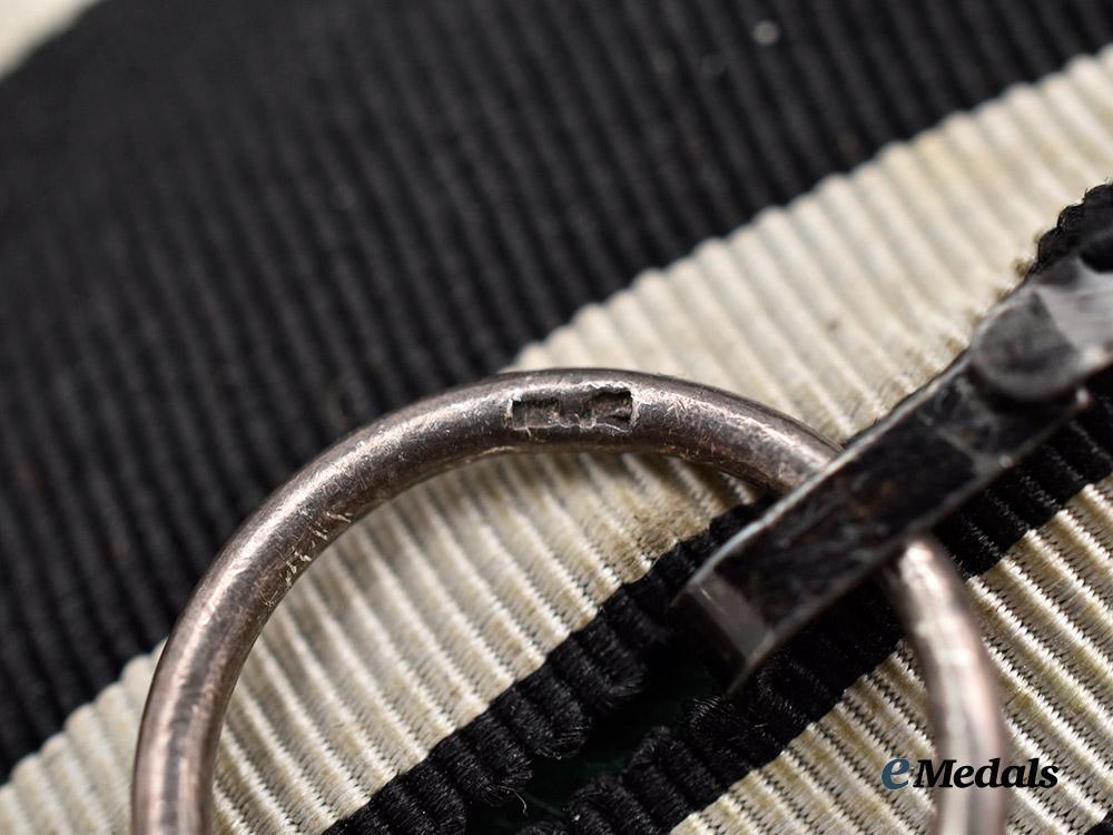 (Eisernes Kreuz 1914 II. Klasse an Einzelschnalle). Reinstituted 5 August by Kaiser Wilhelm II. (1914-1918 issue). Constructed of iron and silver, on loop for suspension with its period original ribbon affixed to a parade mount with a horizontal pinback, consisting of a Cross Pattée with a blackened magnetic iron core within a ribbed silver frame, the obverse with a central initial “W”, the six o’clock arm with a reinstitution date of “1914”, the twelve o’clock arm with a royal crown, the reverse with three central oak leaves, the six o’clock arm with an initial institution date of “1813”, the twelve o’clock arm with initials “FW” topped by a royal crown, the suspension loop maker marked with an illegible logo, measuring 42.56 mm (w) x 46.68 mm (h), weighing 15.6 grams, in extremely fine condition