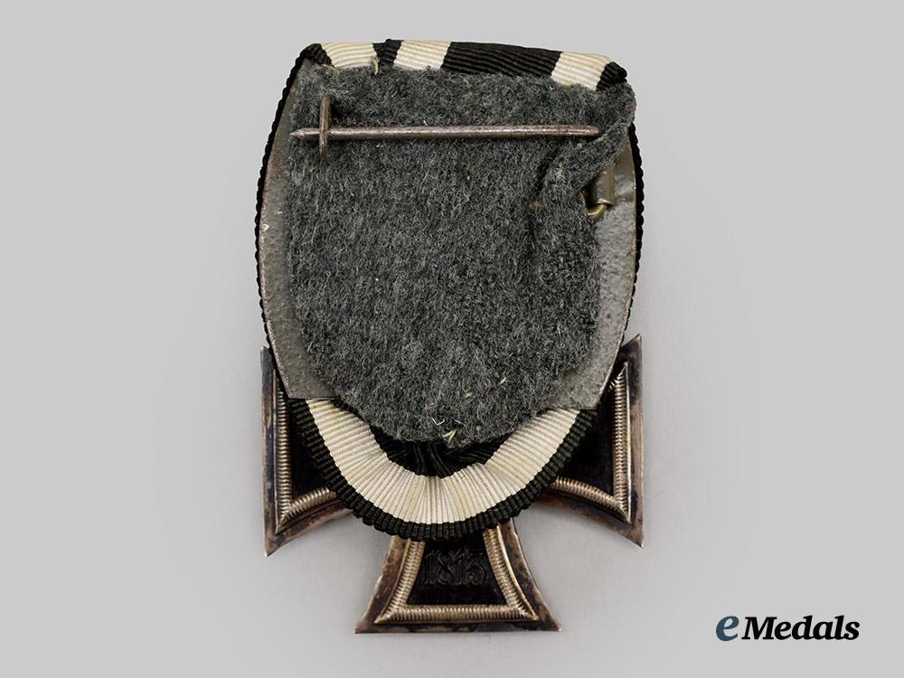 (Eisernes Kreuz 1914 II. Klasse an Einzelspange). Reinstituted 5 August 1914 by Kaiser Wilhelm II. (1914-1918 issue). Constructed of iron and silver, on loop for suspension with its period original ribbon affixed to a single parade mount with a horizontal pinback, consisting of a Cross Pattée with a blackened magnetic iron core within a ribbed silver frame, the obverse with a central initial “W”, the six o’clock arm with a reinstitution date of “1914”, the twelve o’clock arm with a royal crown, the reverse with three central oak leaves, the six o’clock arm with an initial institution date of “1813”, the twelve o’clock arm initials “FW” topped by a royal crown, without visible marks, measuring 43.22 mm (w) x 47.47 mm (h), in extremely fine condition.