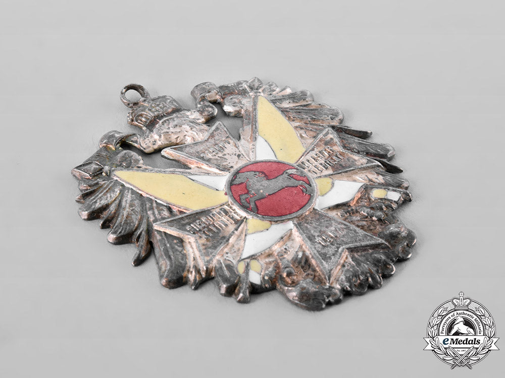 A Veteran’s Guelphic Order Badge A badge constructed of die stamped non-magnetic metal and multi-coloured enamels, the obverse bears an eight-pointed cross paty, with a central medallion of a horse on a red enamel background, the arms of the cross paty read “21 SEPT. SUSCIPERE ET FINIRE NEC ASPERA TERRENT 1907” (SUPPORT AND LIMIT THE HARDSHIPS DO NOT DETER US), two yellow and white flag staffs lay in the quadrants between the arms, superimposed on a crowned eagle with outstretched wings, the reverse is plain, with loop for suspension, measuring 40.60 mm (w) x 48.51 mm (h); all very fine.