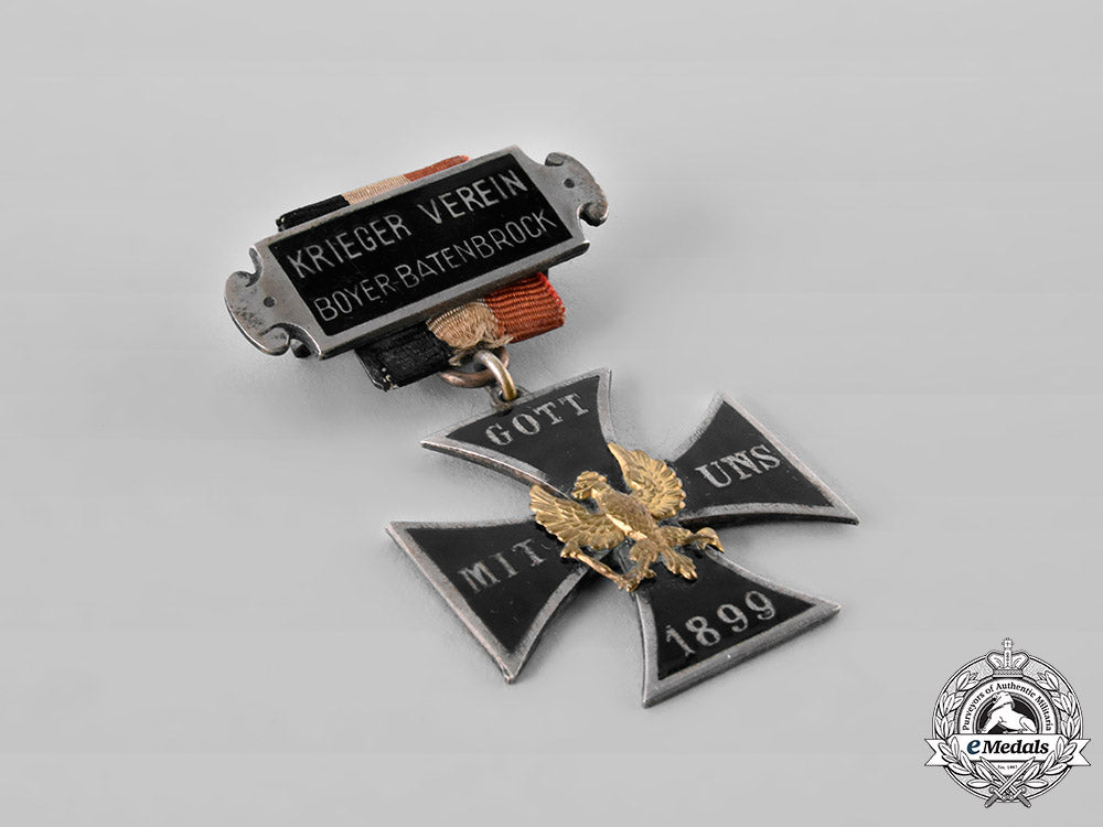 A Boyer-Batenbrock Warrior Association Medal An iron cross paty constructed of silvered bronze and black enamel, the obverse centre bears a royal eagle, the cross arms are black enamel and read “GOTT MIT UNS 1899” (GOD WITH US 1899), on a ribbon suspension in black enamel inscribed with “KRIEGER VEREIN BOYER-BATENBROCK”, on a red, black and white ribbon with metal backer, the reverse bears a horizontal pinback, measuring 34.82 mm (w) x 62.42 mm (h);