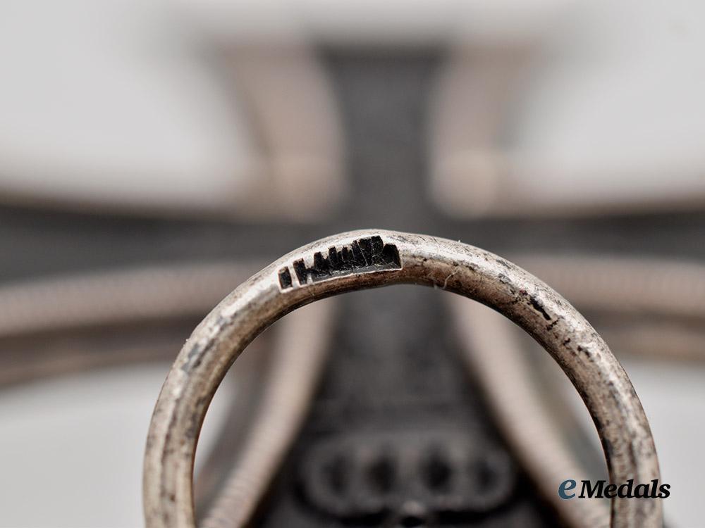 1. A 1914 award, constructed of iron and silver, on loop for suspension from its period original ribbon, consisting of a Cross Pattée with a blackened magnetic iron core within a ribbed silver frame, the obverse with a central initial “W”, the six o’clock arm with a reinstitution date of “1914”, the twelve o’clock arm with a royal crown, the reverse with three central oak leaves, the six o’clock arm with an initial institution date of “1813”, the twelve o’clock arm with initials “FW” topped by a royal crown, the suspension loop stamped with an illegible maker’s mark, measuring 43.16 mm (w) x 46.77 mm (h), weighing 16.8 grams, in extremely fine condition.