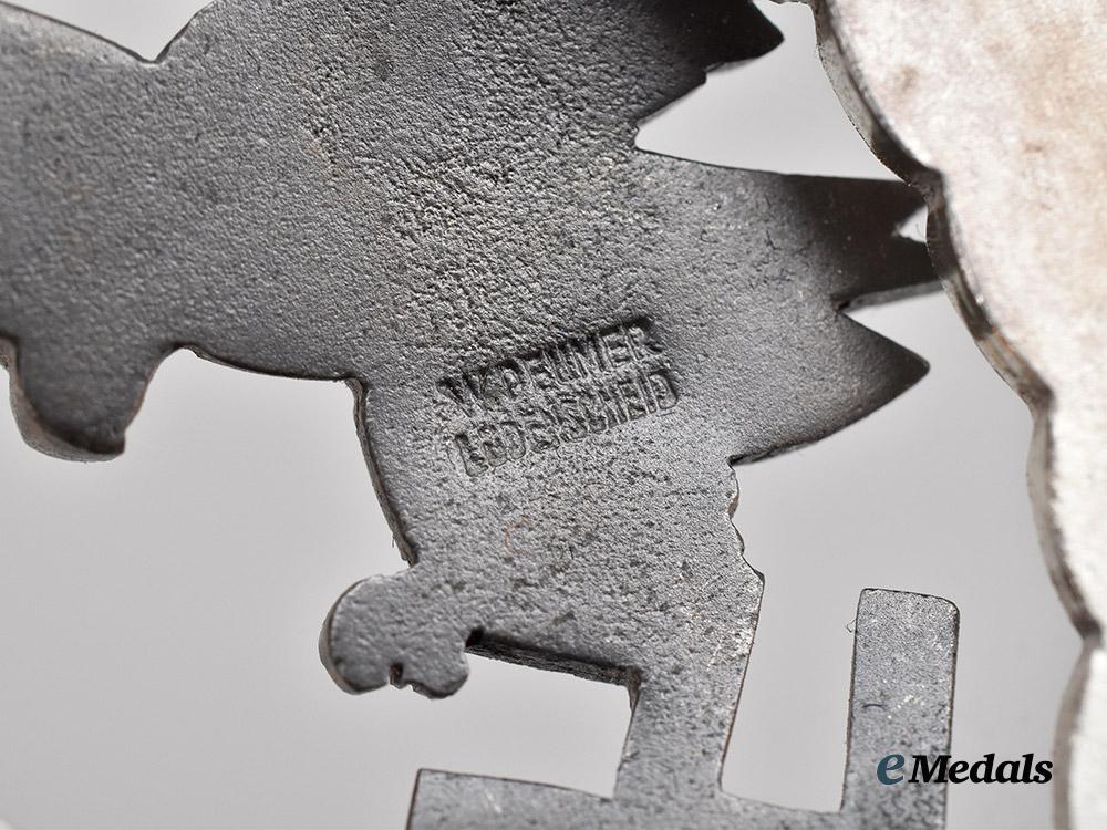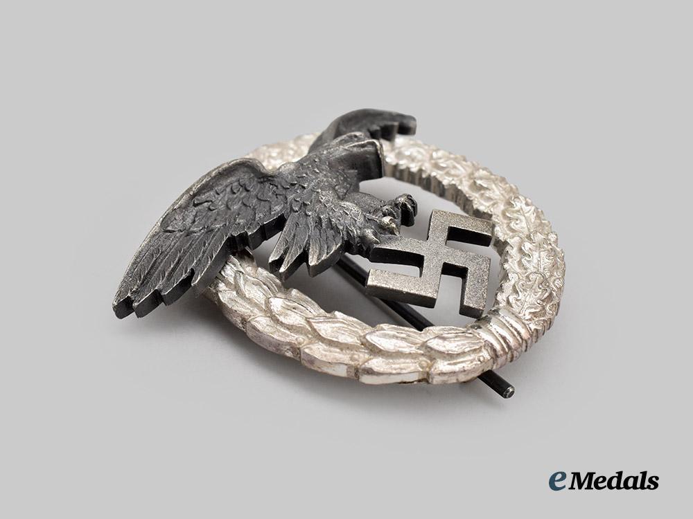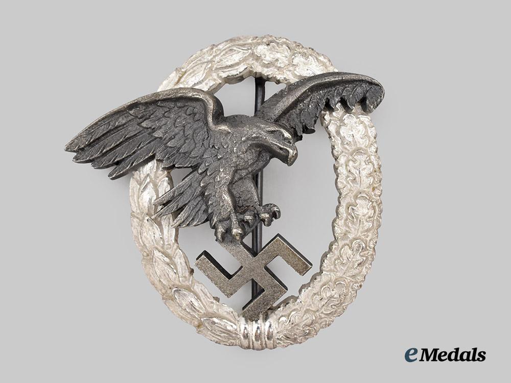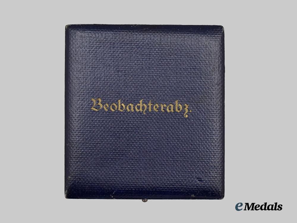 (Beobachterabzeichen mit Etui). Constructed of silvered tombak, the obverse consisting of an oval laurel and oak leaf wreath, joined together at the bottom by ribbon, overlaid by a swooping Luftwaffe eagle clutching a mobile swastika, the reverse with two visible rivets securing the eagle in position, with a barrel hinge and vertical pinback meeting a round wire catch, maker marked “W. DEUMER, LÜDENSCHEID”, measuring 53.53 mm (w) x 52.31 mm (h), weighing 42.4 grams, accompanied by its original presentation case, constructed of a pressed card stock frame with a dark blue leatherette exterior liner, the lid bearing a gilt inscription of “BEOBACHTERABZ.”, the interior with a padded blue rayon lid liner and slotted dark blue felt medal bed, closing with a functional metal spring catch with exterior stud release, unmarked, measuring 75 mm (w) x 80 mm (l) x 25 mm (h), demonstrating minor material fatigue to the interior of the case, a striking early badge in near mint condition.