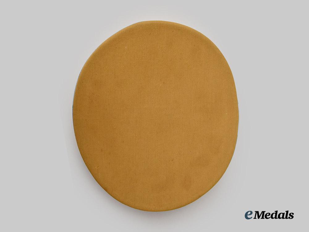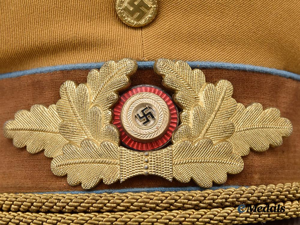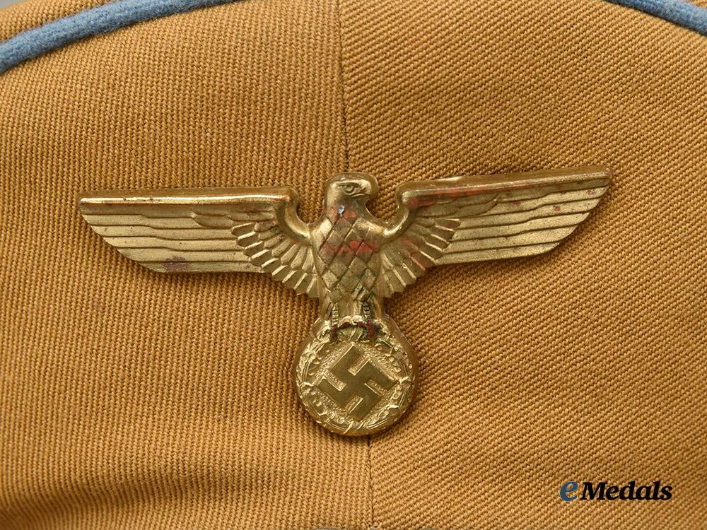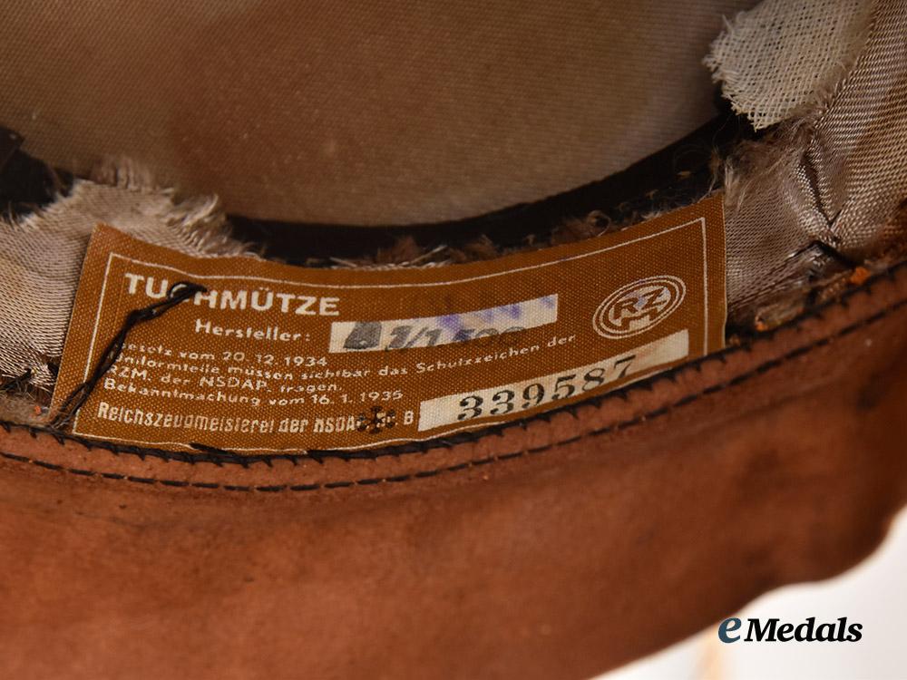(NSDAP Schirmmütze für Politische Leiter). An Orts-level NSDAP Political Leader’s visor cap, constructed of a light brown rayon/wool blended cloth with a whipcord weave. The cap features reinforced side walls liner on the exterior with a smooth dark brown doeskin cap band. Both the top and bottom edges of the band are trimmed with blue piping, while an additional length of identical piping surrounds the outer edge of the crown. Pinned onto the peak is an insignia consisting of a gilded bronze NSDAP-style German national eagle clutching a wreathed mobile swastika, measuring 65 mm (w) x 30 mm (h). Directly below the eagle, the centre of the cap band is pinned with a multi-piece wreath and cockade, constructed of gilded bronze with multi-coloured enamels, measuring 110 mm (w) x 45 mm (h) overall. The lower edge of the cap band is flanked by gilded and pebbled magnetic metal buttons which retain an original chinstrap constructed of multiple rows of twisted and rolled gold bullion wire. A protruding vulcanfibre visor completes the exterior features, and is finished in dark brown on the obverse and in a lighter brown on the reverse. The interior is partially encompassed by a beige rayon liner, while a brown leather sweatband surrounds the walls. The crown retains an intact transparent plastic rhomboid moisture guard. A Reichszeugmeisterei (RZM) label is retained beneath the sweatband and bears a stamped maker’s mark which appears to read “B1/1500”. The cap measures approximately 24 cm (w) x 28 cm (l) x 16 cm (h). Issues consistent with age and possible refurbishment are evident, and include minor material fatigue to the exterior material, some loss of finish to the metal insignia, and extensive wear throughout the interior liner which has exposed the crown’s underlay, as well as the loss of material throughout the walls, indicating restoration. The cap remains in a very fine condition.