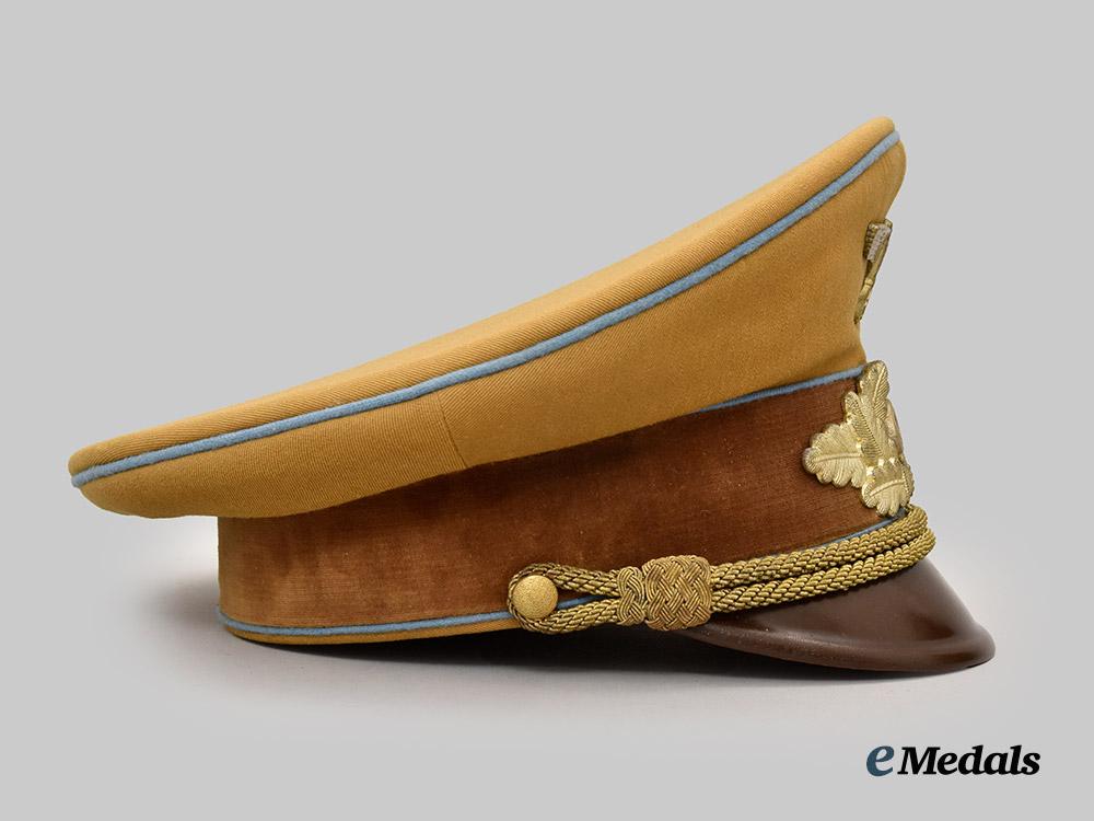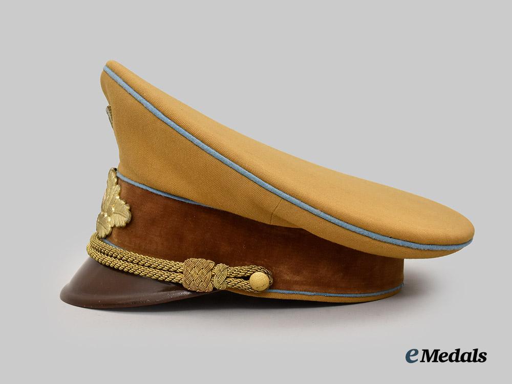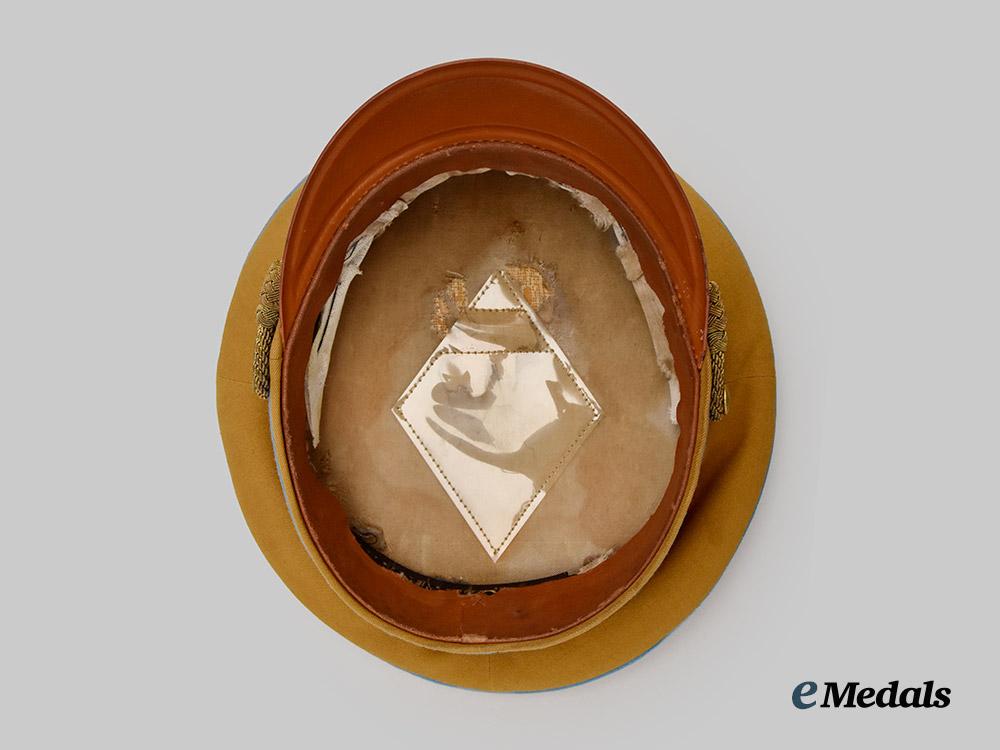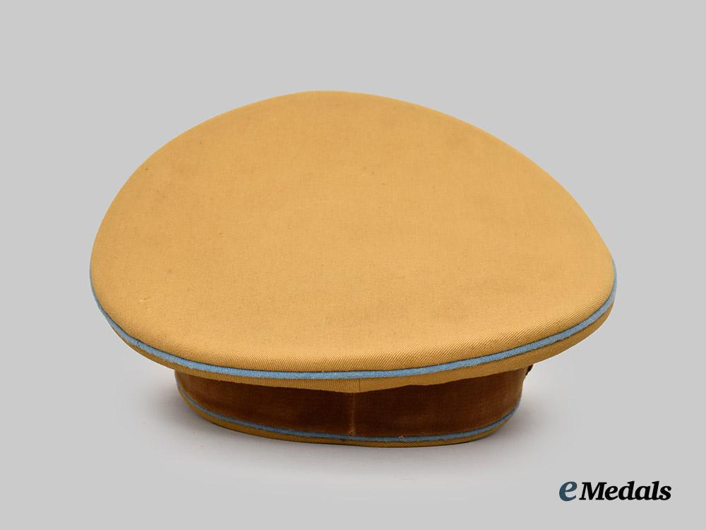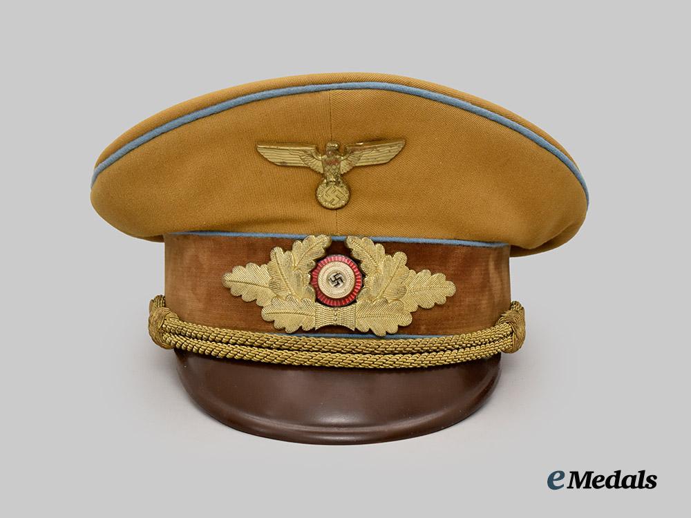 (NSDAP Schirmmütze für Politische Leiter). An Orts-level NSDAP Political Leader’s visor cap, constructed of a light brown rayon/wool blended cloth with a whipcord weave. The cap features reinforced side walls liner on the exterior with a smooth dark brown doeskin cap band. Both the top and bottom edges of the band are trimmed with blue piping, while an additional length of identical piping surrounds the outer edge of the crown. Pinned onto the peak is an insignia consisting of a gilded bronze NSDAP-style German national eagle clutching a wreathed mobile swastika, measuring 65 mm (w) x 30 mm (h). Directly below the eagle, the centre of the cap band is pinned with a multi-piece wreath and cockade, constructed of gilded bronze with multi-coloured enamels, measuring 110 mm (w) x 45 mm (h) overall. The lower edge of the cap band is flanked by gilded and pebbled magnetic metal buttons which retain an original chinstrap constructed of multiple rows of twisted and rolled gold bullion wire. A protruding vulcanfibre visor completes the exterior features, and is finished in dark brown on the obverse and in a lighter brown on the reverse. The interior is partially encompassed by a beige rayon liner, while a brown leather sweatband surrounds the walls. The crown retains an intact transparent plastic rhomboid moisture guard. A Reichszeugmeisterei (RZM) label is retained beneath the sweatband and bears a stamped maker’s mark which appears to read “B1/1500”. The cap measures approximately 24 cm (w) x 28 cm (l) x 16 cm (h). Issues consistent with age and possible refurbishment are evident, and include minor material fatigue to the exterior material, some loss of finish to the metal insignia, and extensive wear throughout the interior liner which has exposed the crown’s underlay, as well as the loss of material throughout the walls, indicating restoration. The cap remains in a very fine condition.