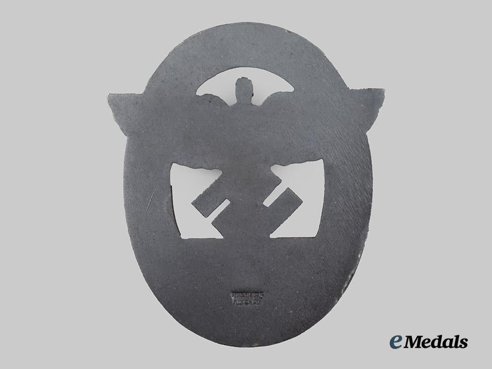 (Nationalsozialistisches Fliegerkorps Plakette mit Etui). Constructed of toned feinzink, the obverse consisting of an oval plaque bearing a raised NSFK insignia, situated above a dedication of “REICHSWETTBEWERB FÜR ANTRIEBSFLUGMODELLE BORKENBERG 25.-28. 8. 39” (“NATIONAL COMPETITION FOR POWERED MODEL AIRCRAFT IN BORKENBERG 25.-28. 8. 39”), the reverse maker marked “BREHMER, MARKNEUKIRCHEN”, measuring 55 mm (w) x 65 mm (h), accompanied by its original presentation case, of two-piece card stock construction, the lid bearing a silvered NSFK insignia, unmarked, measuring 65 mm (w) x 75 mm (l) x 15 mm (h), a matching set in extremely fine condition.