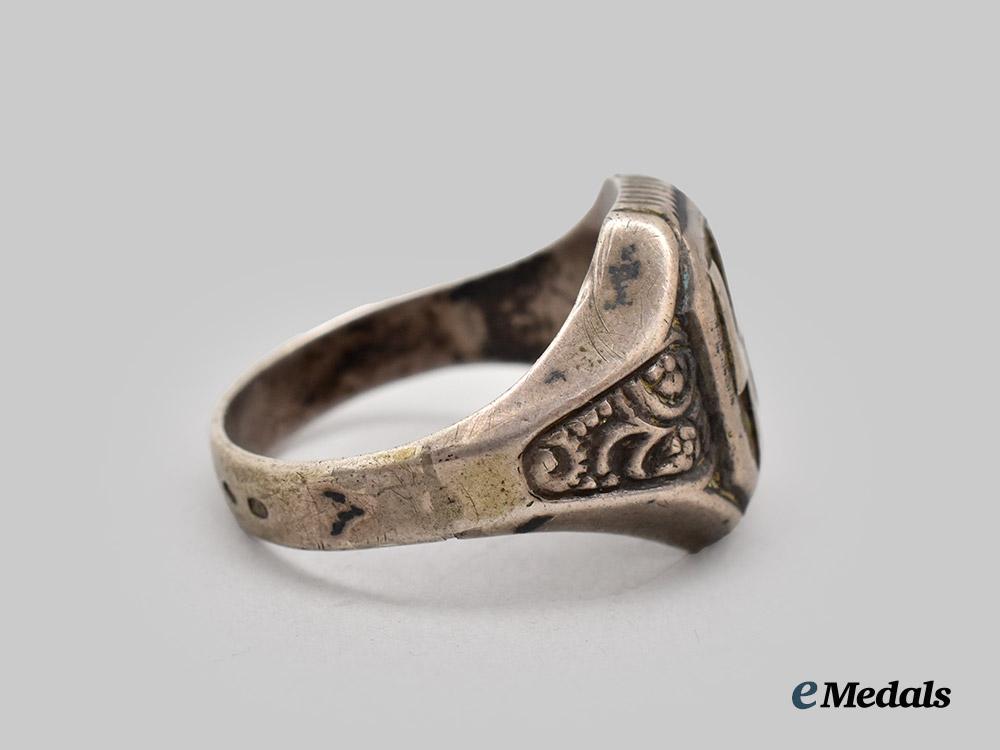 (SS Fingerring). Constructed of a silver alloy, the exterior bearing dual raised Sig runes, flanked on each side by arabesque latticework, unmarked, corresponding to a men’s size 11, weighing 4.4 grams, an unofficial and privately-purchased example obtained by the owner to commemorate his SS service, in near extremely fine condition.