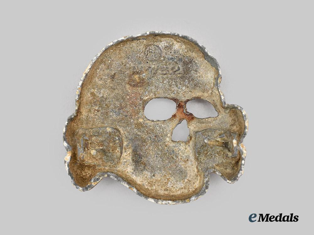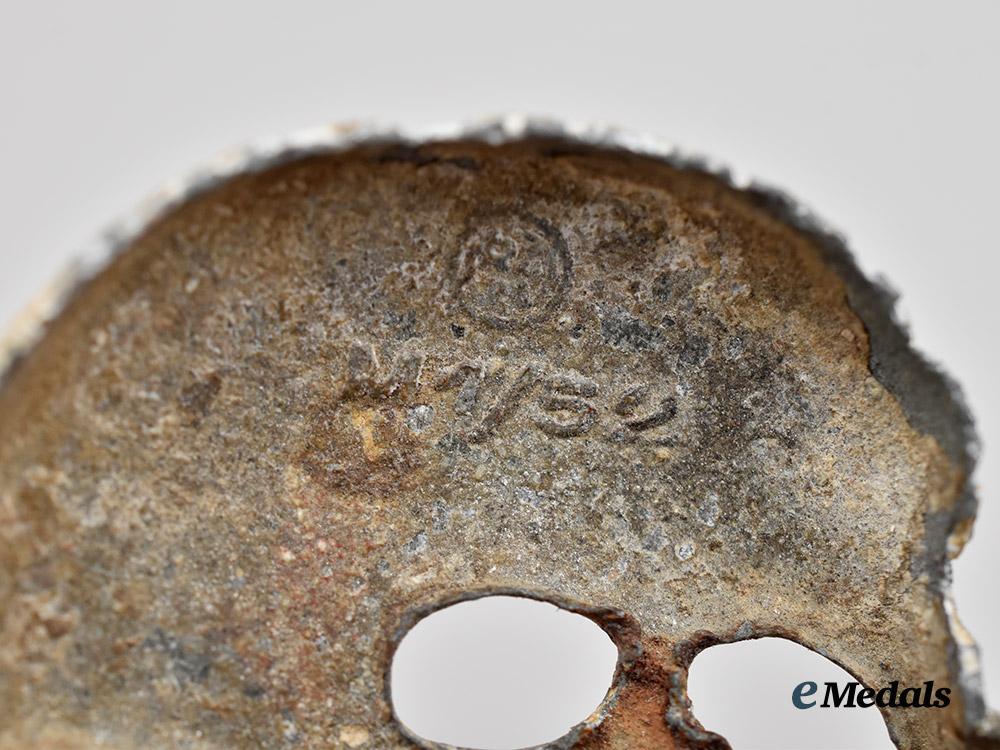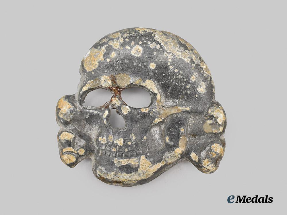(Waffen-SS Totenkopf für die Schirmmütze). Constructed of silvered zink, the obverse consisting of a second pattern SS-style Totenkopf, the reverse marked with a Reichszeugmeisterei (RZM) logo and maker code “M1/52” for Deschler & Sohn, Munich, measuring 30.95 mm (w) x 28.90 mm (h), weighing 4.2 grams, demonstrating near-total loss of silver finish to the base metal with significant oxidation, in addition to some chipping along the edges of both the exterior and the interior features, a field-worn and ground-dug example in fair condition.