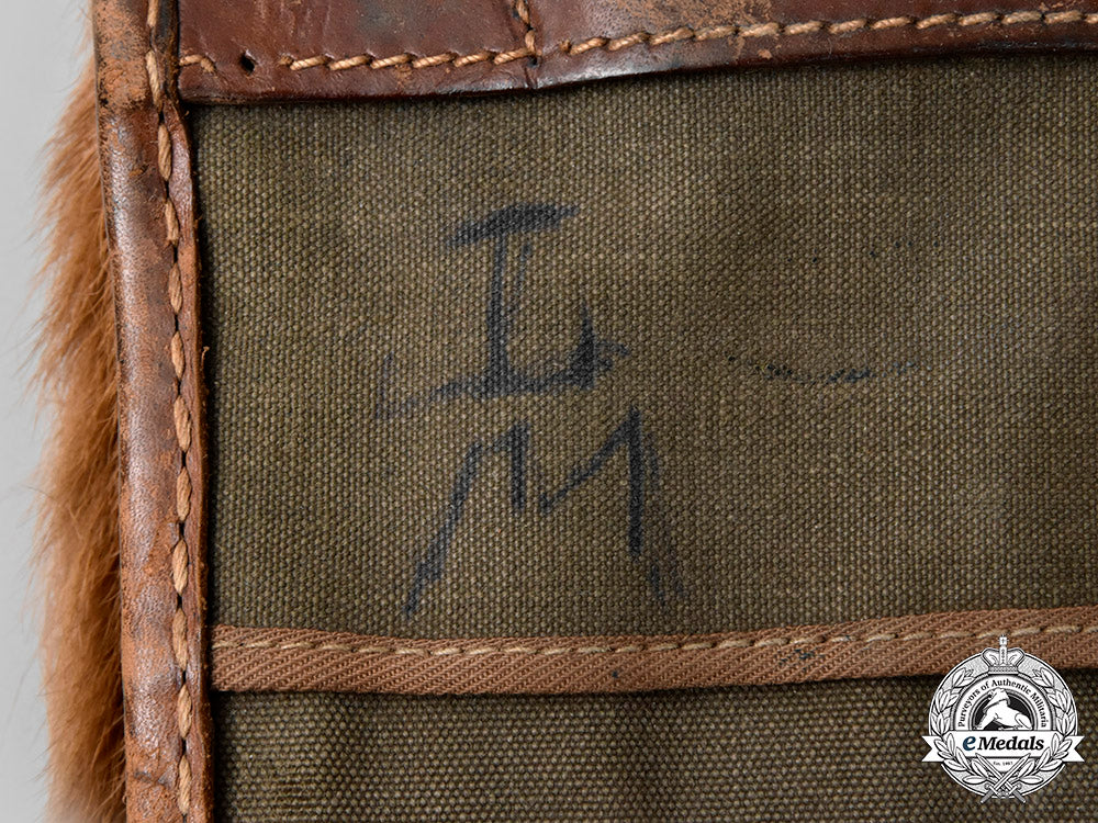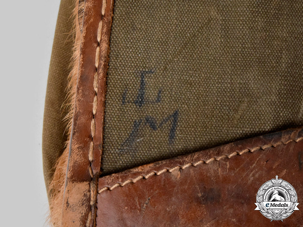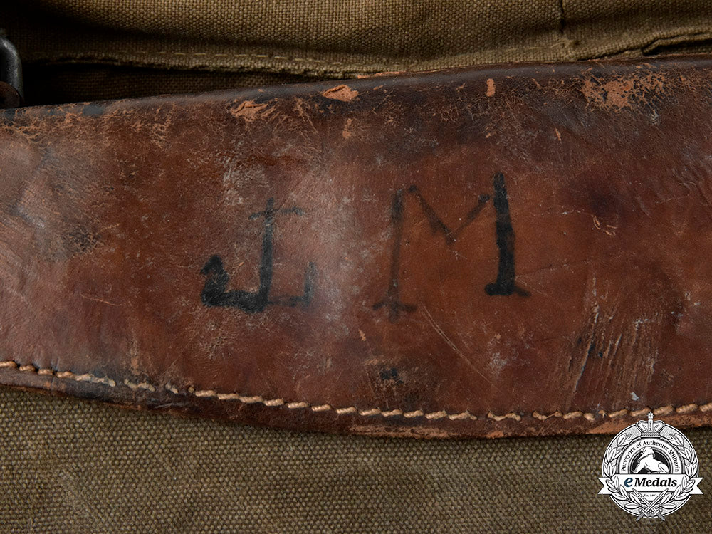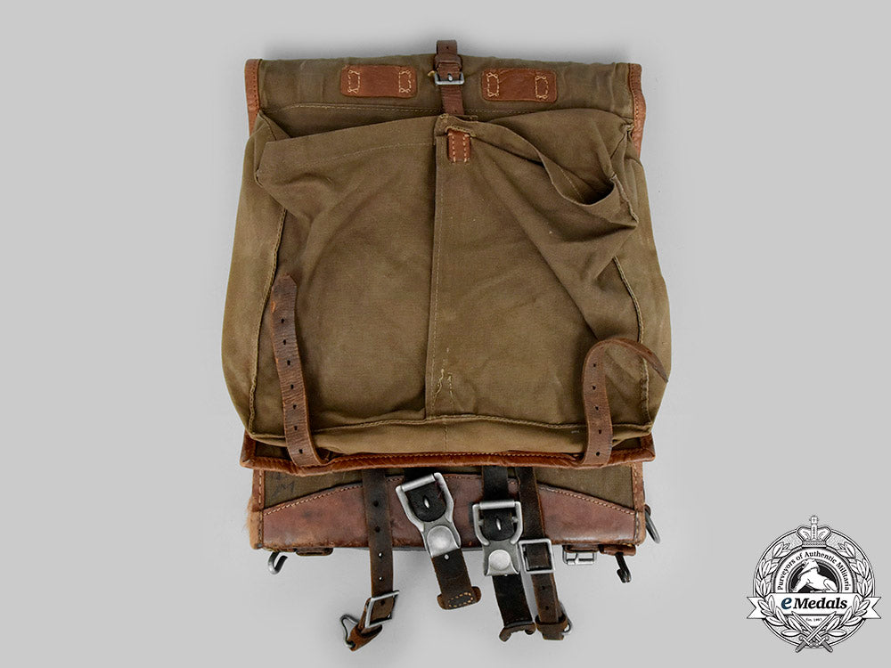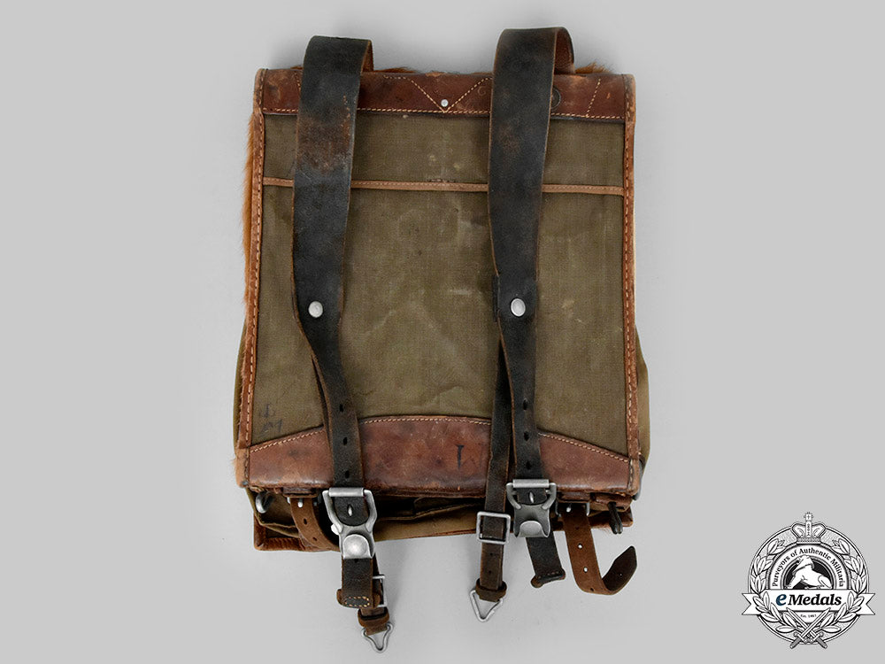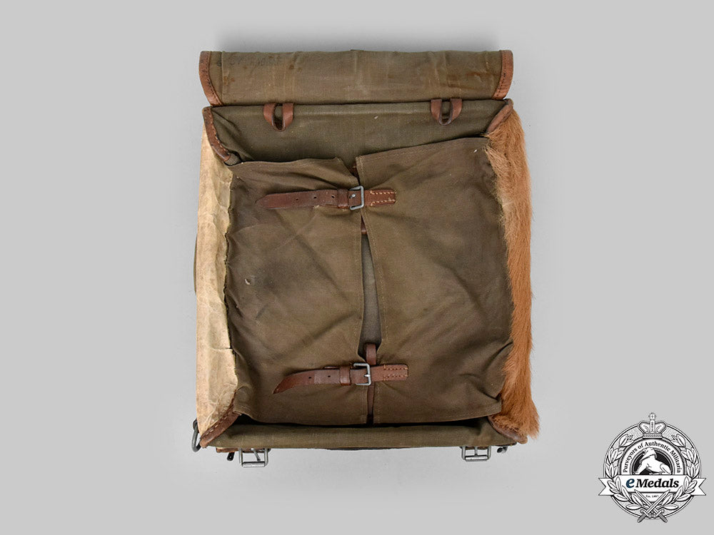 1937 Issue. Rectangular backpack structured internally with wood, olive green canvas back and interior with brown leather fittings and metal buckles, front and sides constructed of brown cowhide (fur striped from left side panel) with two brown leather loops secured with brown thread stitching and on the left a D-ring attached with a brown leather loop and brown thread stitching, front bears four leather loops attached by brown thread stitching, measuring 57.15 mm, and two brown leather straps with eight buckling holes on the left strap and seven buckling holes on the right, a brown leather panel is across the top with a metal rectangular ring attached by brown thread stitching and six metal fasteners, centre stitched into a “V” shape with maker stamped in centre with inscription “JUST & CO A.G. 1937 Geraberg”, miscellaneous writing on leather “TISHER”, “ADERHOLD”, “Reinhild”, “Aderhold”, “Gefr. Straub” carved on centre right, two slots for insertion of straps fastened with metal fastener, brown leather straps with three top buckling holes (to be fastened to pack), six buckling holes labeled “6, 5, 4, 3, 2, 1” between each hole with metal buckle with hook, bottom half of straps attached to main leather strap with a single metal fastener and has five buckling holes, metal buckle and triangle loop to attach strap to lower part of pack, green canvas back with “WT” written twice on left side, leather lower with “WT” written on the right side, bottom bears two metal hooks to fasten straps and two metal buckles with loop on the left and right side, inside of flap constructed of olive green canvas and brown leather fittings, A-style pocket flap opening with two brown leather loops inside attached by brown thread stitching, a brown leather buckling strap with six buckling holes is attached by brown thread stitching to the outer left pocket flap with stitching reinforced hole for strap to go through on the left and right pocket flaps, brown leather loop on bottom of pocket for strap to go through and metal buckle attached with leather and thread to secure strap, two brown leather loops to either side of buckle attached with brown thread, top of pocket has tag with “Arbeitsmann Bahlbrech Wolf 6/321” (The workman Bahlbrech Wolf 6/321), the main body is constructed of green canvas double flaps with two metal buckles secured with brown leather and brown thread stitching and two brown leather buckling straps with four buckling holes, two brown leather loops at the top and one centred brown leather loop, measuring 330.2 mm (w) x 381 mm (h) x 63.5 (d), straps 571.5 mm (in current position), fine.