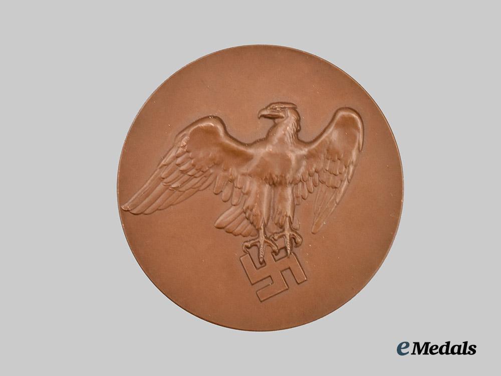 (Erinnerungsmedaille des Reichsministers für Ernährung und Landwirtschaft). Constructed of bronze, the obverse bearing a raised German national eagle clutching a mobile swastika, the reverse bearing a central inscription of “FÜR BESONDERE LEISTUNGEN IN DER TIERZUCHT” (“FOR SPECIAL ACHIEVEMENTS IN ANIMAL HUSBANDRY”), circumscribed by an inscription of “DER REICHSMINISTER FÜR ERNÄHRUNG UND LANDWIRTSCHAFT” (“THE REICH MINISTER FOR FOOD AND AGRICULTURE”), unmarked, measuring 48 mm in diameter, in extremely fine condition.