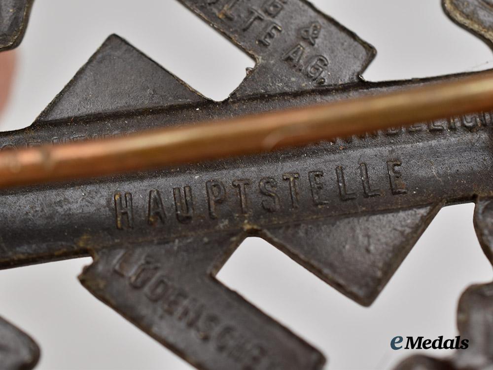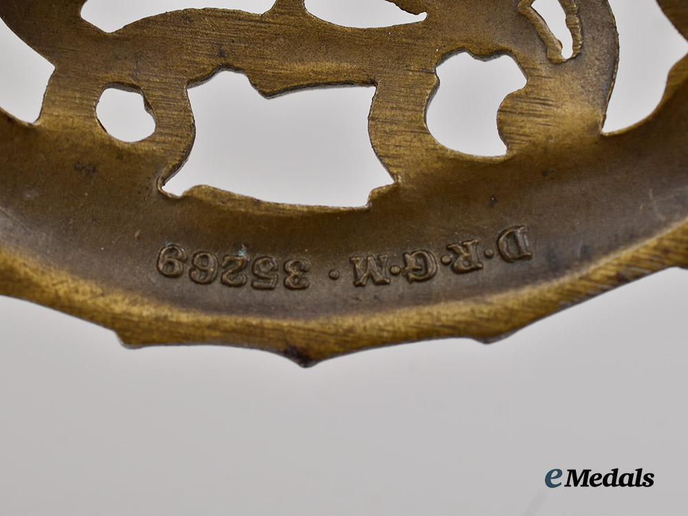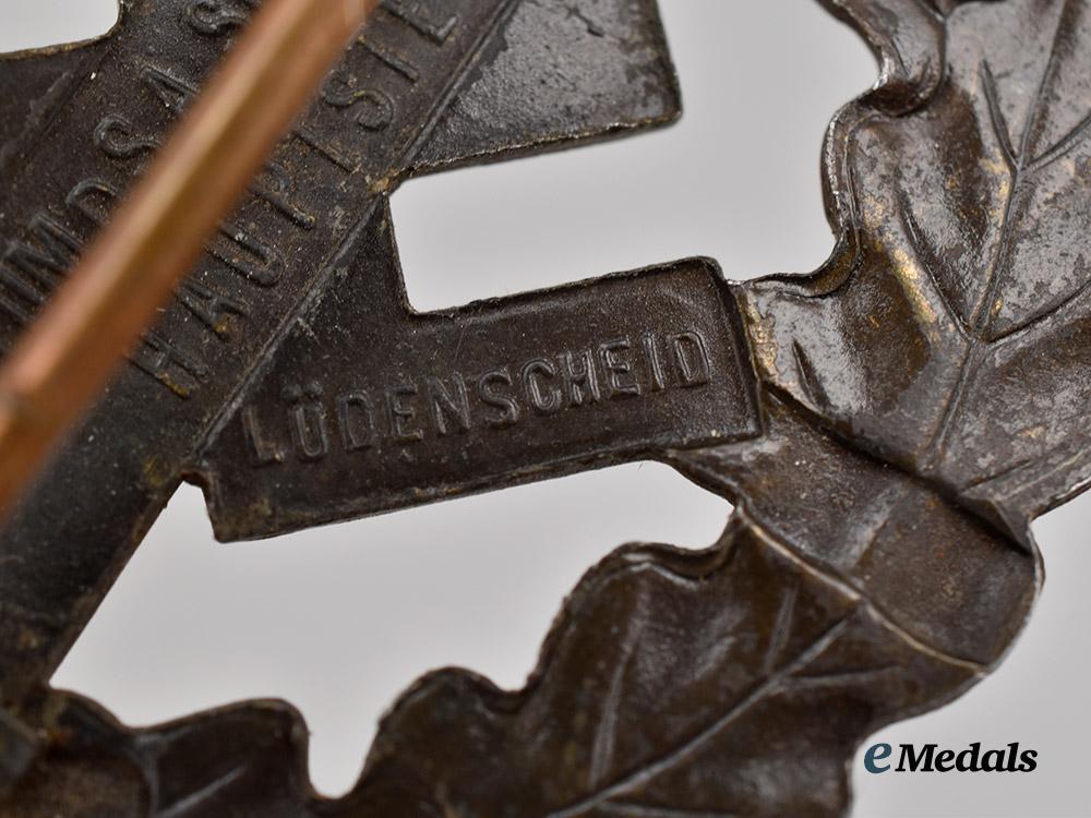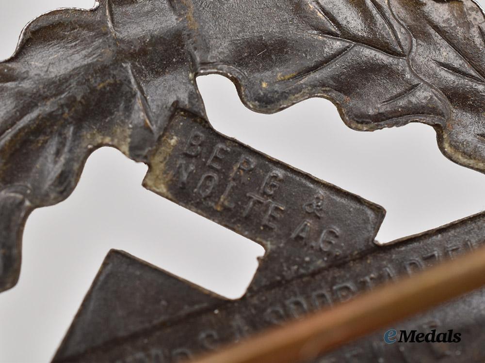 4. A Sturmabteilung (SA) Sports Badge, Bronze Grade, constructed of bronzed magnetic metal, the obverse consisting of a circular oak leaf wreath, surrounding a central mobile swastika overlaid by a sword, the reverse with an integral hinge and vertical pinback meeting a flat wire catch, maker marked “BERG & BOLTE, LÜDENSCHEID”, measuring 45.68 mm (w) x 58.24 mm (h), weighing 16.8 grams, a Type II badge in extremely fine condition.