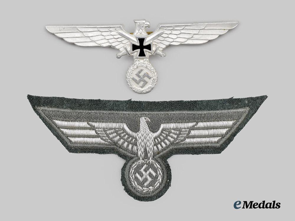 1. A Heer Officer’s breast eagle, constructed of field-grey wool, the obverse bearing a layer of field-grey rayon threading overlaid by a machine-embroidered silver aluminum wire Wehrmacht eagle clutching a wreathed mobile swastika, unmarked, measuring 120 mm (w) x 50 mm (h), demonstrating some material fatigue to the wool underlay, in unissued and extremely fine condition.