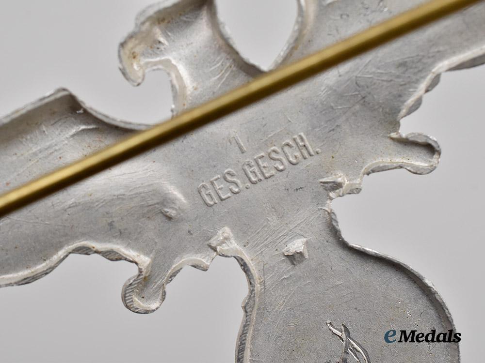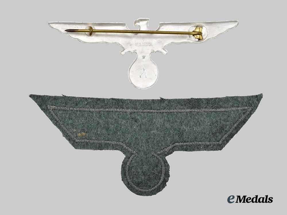 2. An NSRKB breast eagle, constructed of aluminum, the reverse with a crimped hinge and horizontal pinback meeting a round wire catch, unmarked, measuring 95 mm (w) x 35 mm (h), in extremely fine condition.
