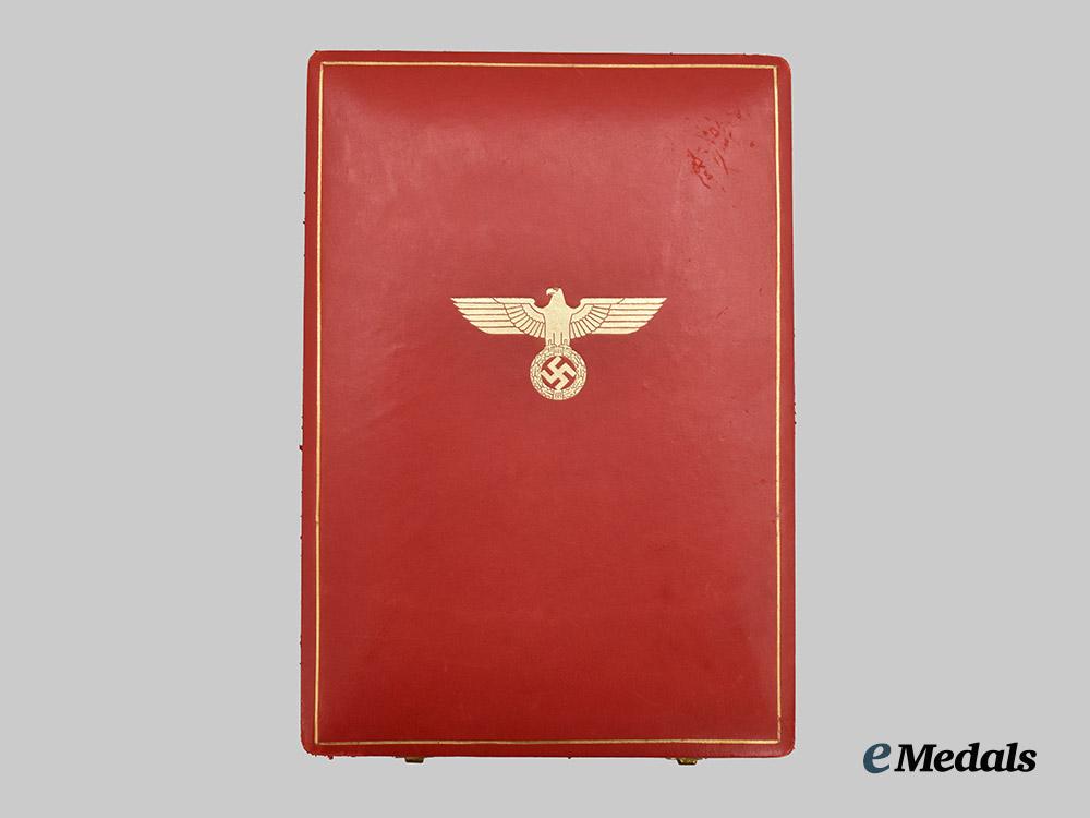 3. A presentation case, constructed of a light wooden frame with a faux red leather exterior liner, the lid bearing a gilt NSDAP-style German national eagle clutching a wreathed mobile swastika, the interior with a padded white rayon lid liner and intact hinge cover, the former bearing a gilt inscription of “ORDEN VOM DEUTSCHEN ADLER / VERDIENSTKREUZ MIT STERN” (the classification of this award according to pre-1943 regulations), with a fitted black velvet medal bed, closing with dual functional gilded metal snap buttons, measuring 16 cm (w) x 24 cm (l) x 3.5 cm (h), demonstrating minor material fatigue to the exterior, in near extremely fine condition.
