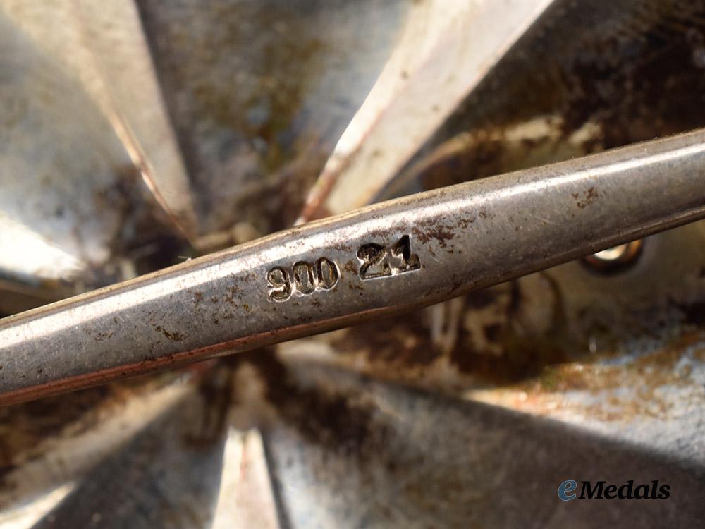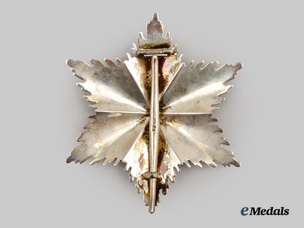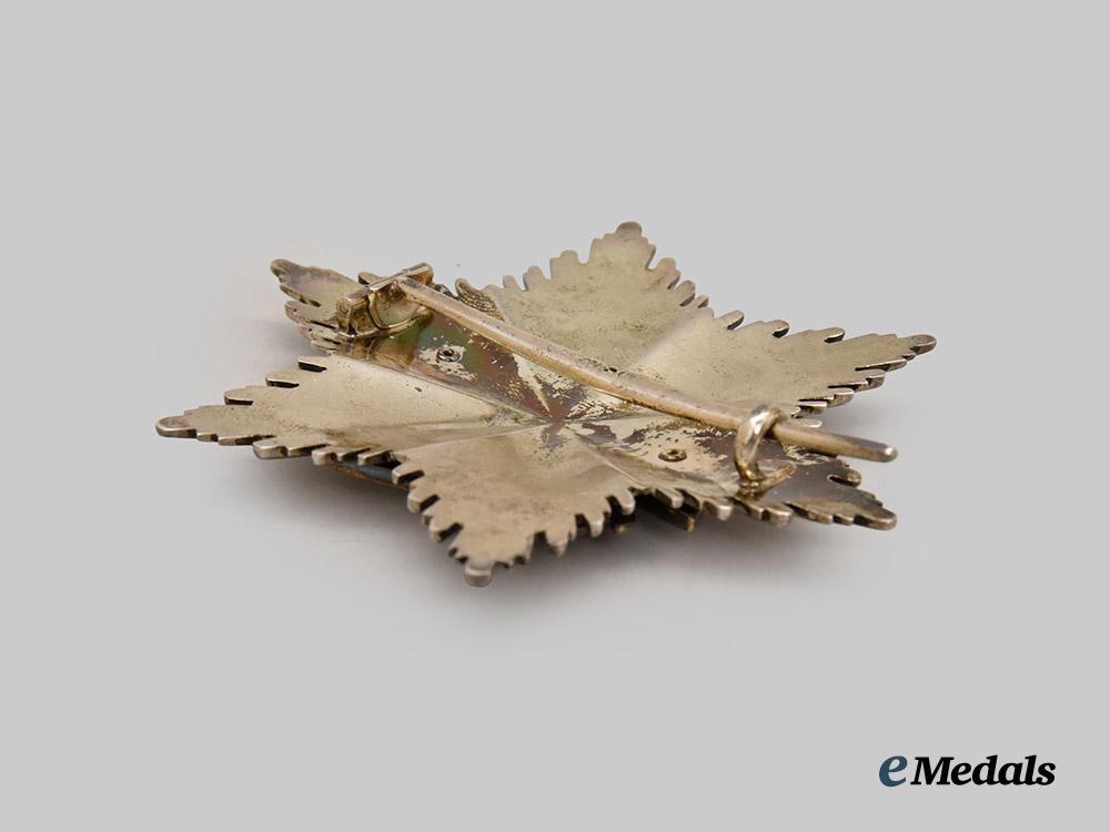 2. A breast star, constructed of gilded silver with enamels, the obverse consisting of a six-pointed radiant starburst, overlaid by a white enameled Maltese Cross with white enameled arms, joined through the quadrants by NSDAP-style German national eagles clutching wreathed mobile swastikas on white enameled discs, the reverse with two visible rivets securing the cross in position, with a barrel hinge and narrow pinback meeting a rounded catch, the pinback stamped with a silver content number of “900” and a Präsidialkanzlei code of “21” for Gebrüder Godet, Berlin, measuring 65.52 mm (w) x 59.04 mm (h), weighing 25.9 grams, in extremely fine condition.