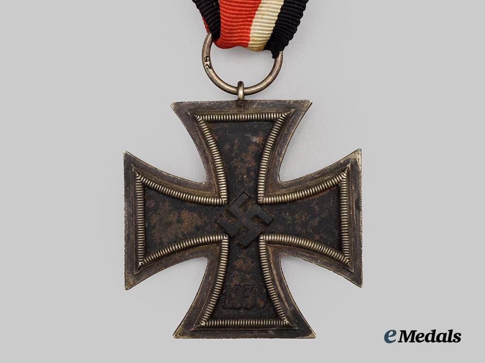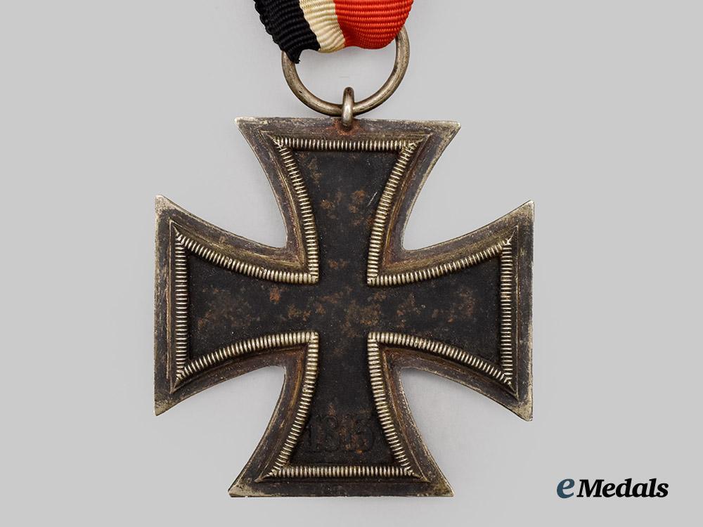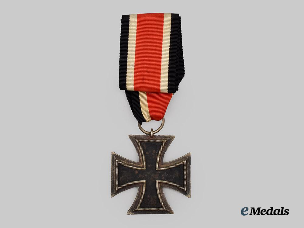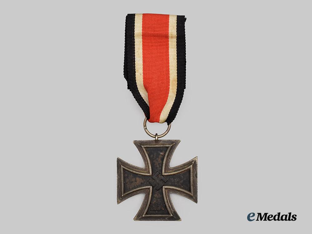 (Eisernes Kreuz 1939 II. Klasse). Reinstituted 1 September 1939. (1939-1945 issue). Constructed of iron and silver, on loop for suspension from its period original ribbon, consisting of a Cross Pattée with a blackened magnetic iron core within a ribbed silver frame, the obverse with a central mobile swastika, the six o’clock arm with a reinstitution date of “1939”, the reverse with an initial institution date of “1813”, the suspension loop maker marked with Präsidialkanzlei code “25” for Arbeitsgemeinschaft der Graveur-, Gold- und Silberschmiedeinnungen, Hanau, measuring 44.21 mm (w) x 47.95 mm (h), weighing 19.0 grams, demonstrating moderate loss of finish and surface oxidation throughout the core, in very fine condition.
