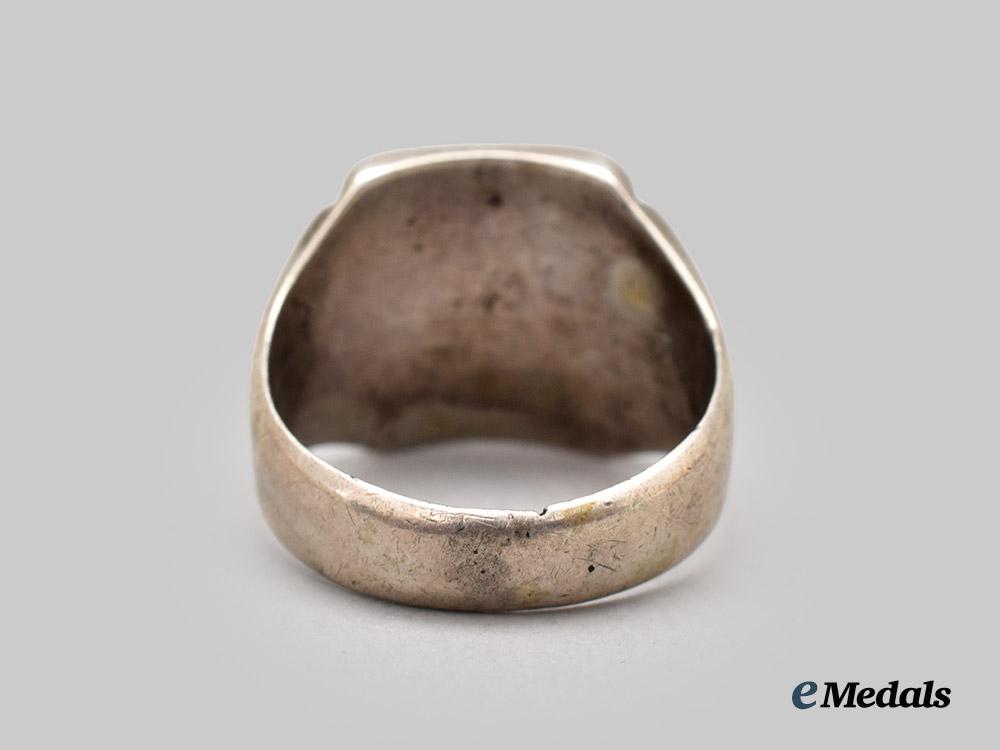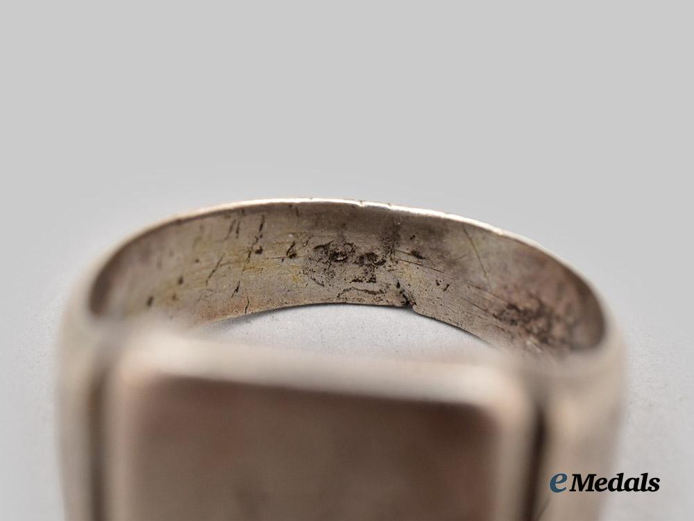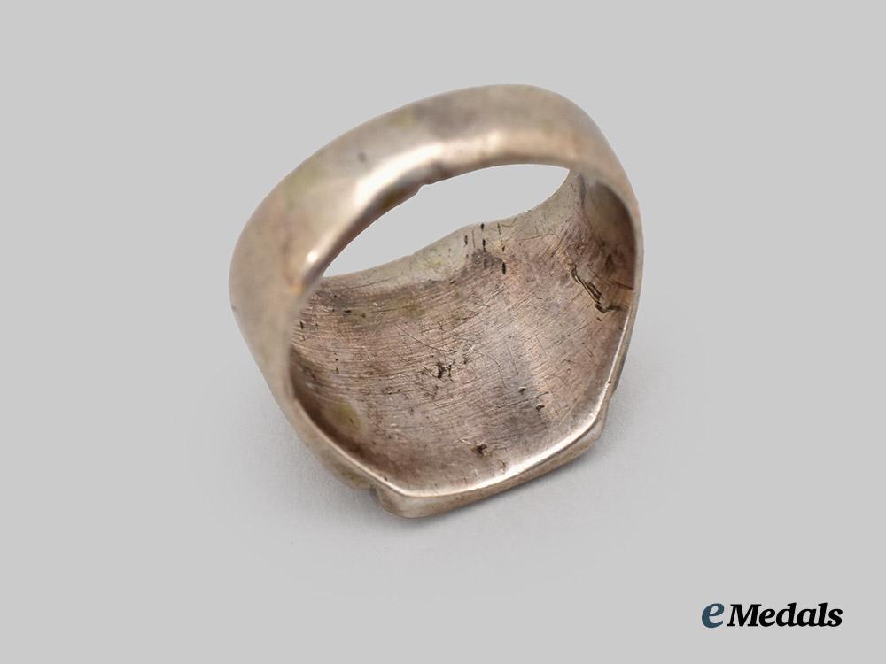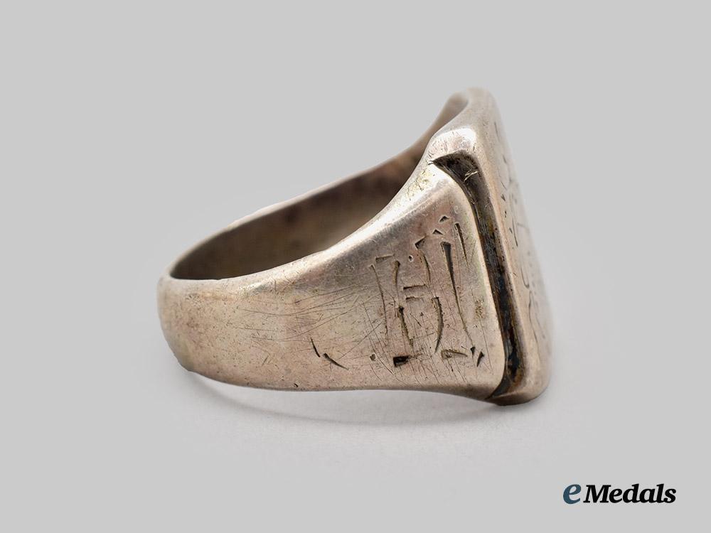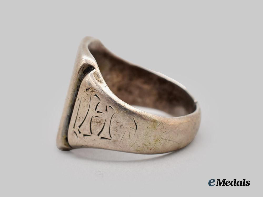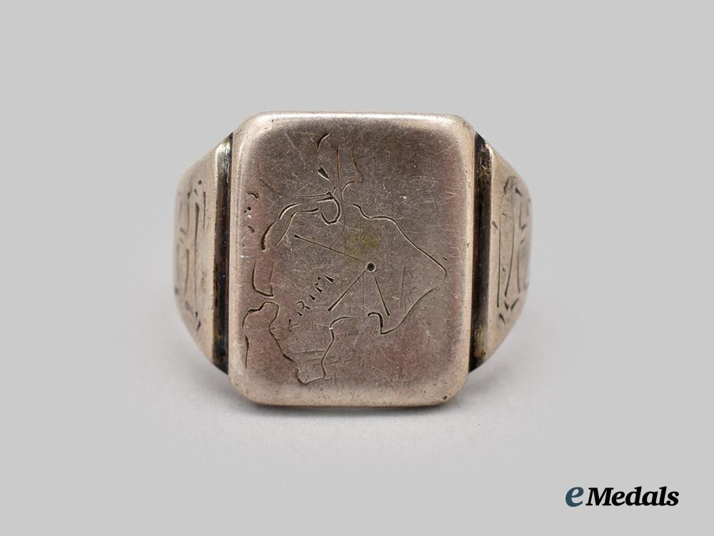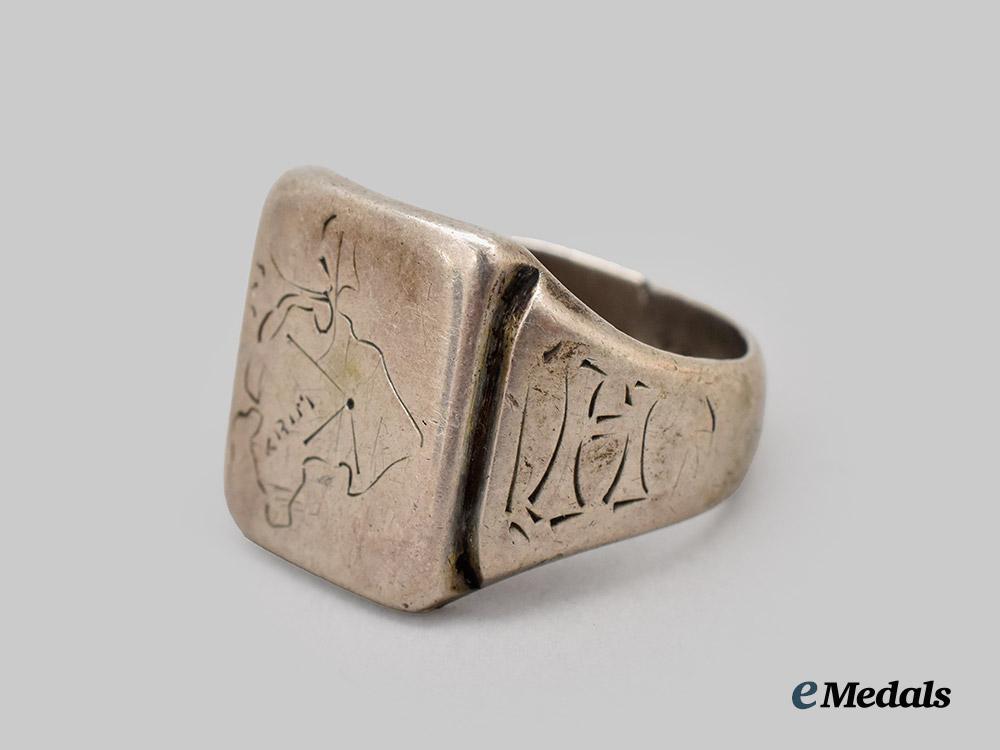 (Fingerring). Constructed of a silver alloy, the exterior featuring a central rectangular plaque bearing a hand-etched map of Crimea, flanked by initials “HH”, unmarked, corresponding to a size 11, weighing 13.6 grams, demonstrating softening of features consistent with wear, in very fine condition.