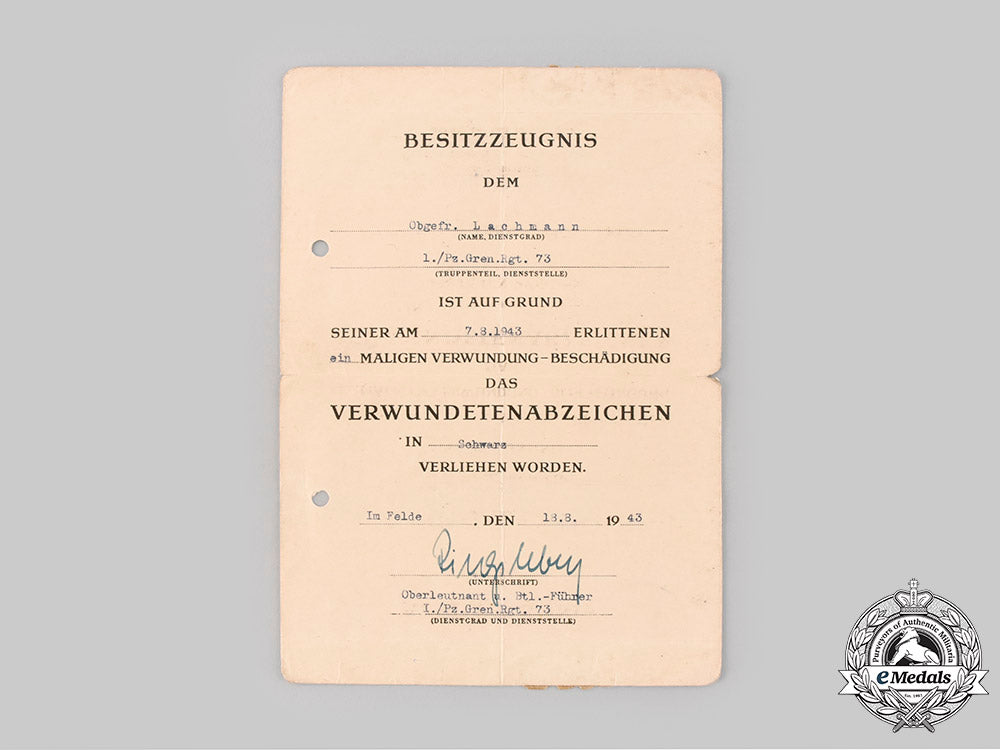 Germany, Wehrmact. A Wound Badge Black Grade Document To Senior Lance Corporal Heinz Lachmann, 1943