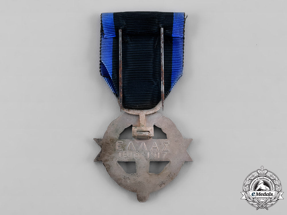 (Πολεμικό Σταυρό 1916-1917). Instituted in 1917. In silvered bronze, measuring 44.5 mm (w) x 48.5 mm (h), original ribbon with dual prong pinback, spotting, near extremely fine.