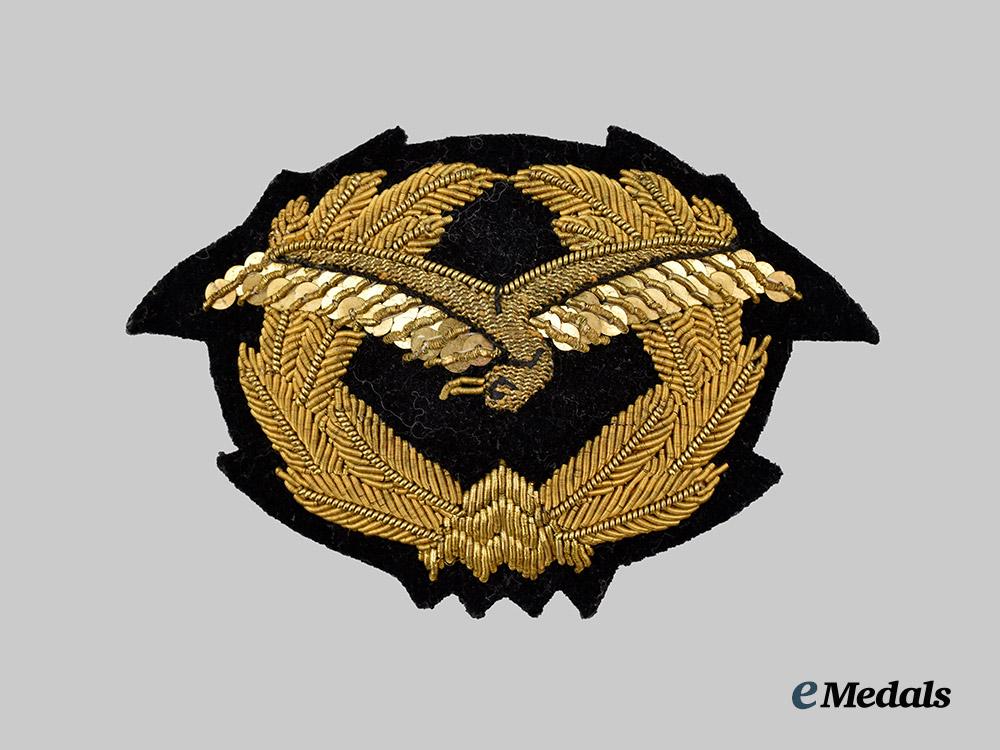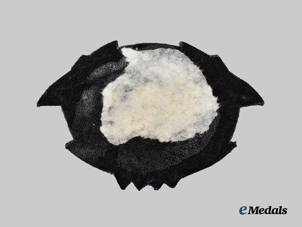Illustrating an eagle backed by an open-ended wreath, both of which are in gold-coloured bullion wire in various textures, with black threading and gold-coloured sequins giving definition to the wings, on a black wool base, padded, with a black cotton backer, measuring 80 mm (w) x 53 mm (h), paper residue evident on the reverse from previous board mounting, near extremely fine.