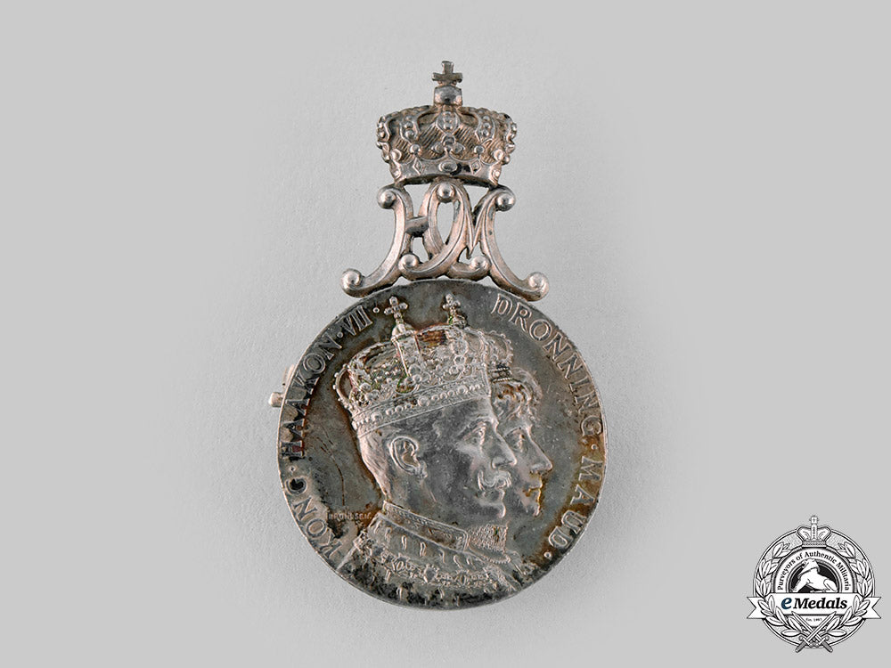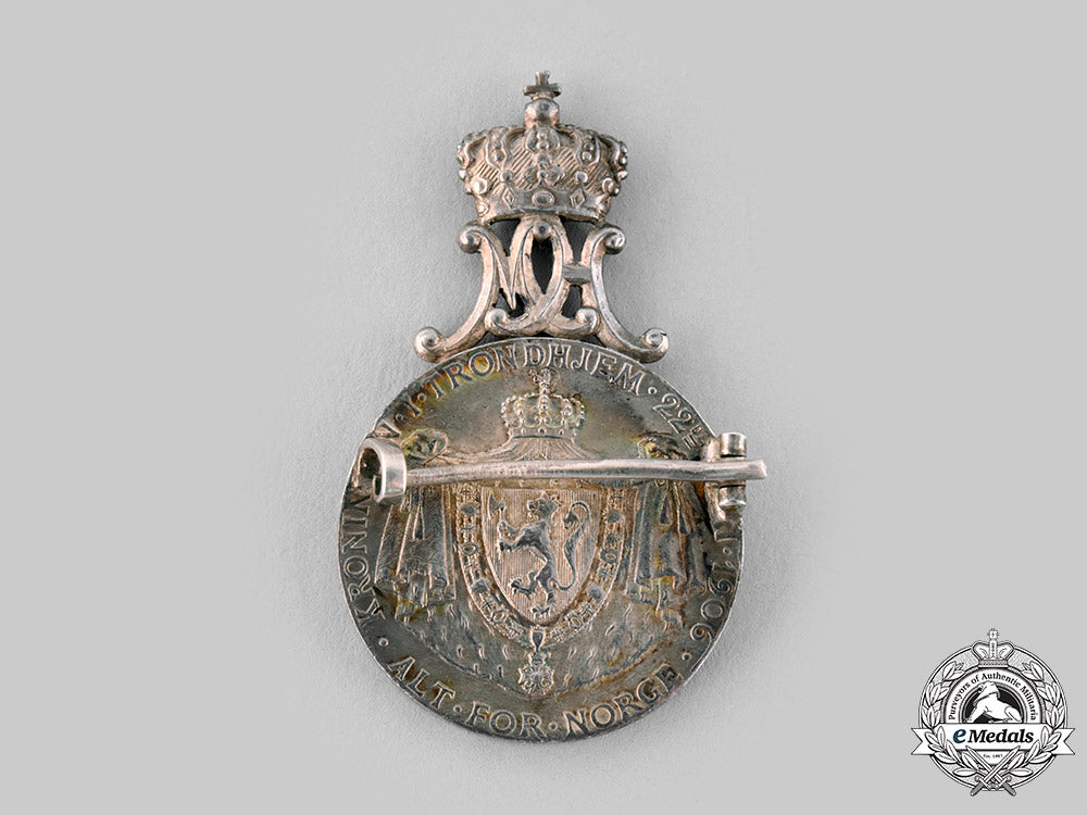 (Haakon VIIs och drottning Mauds Kroningsmedalje). Instituted in 1906. In silver, engraver marked "THRONDSEN SC." on the obverse, measuring 29.3 mm (w) x 49.5 mm (h), the medal having been taken off its original ring suspension, with a horizontal pinback soldered in place on the reverse, contact marks, fine.