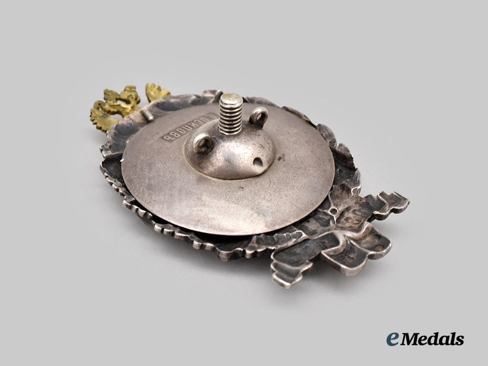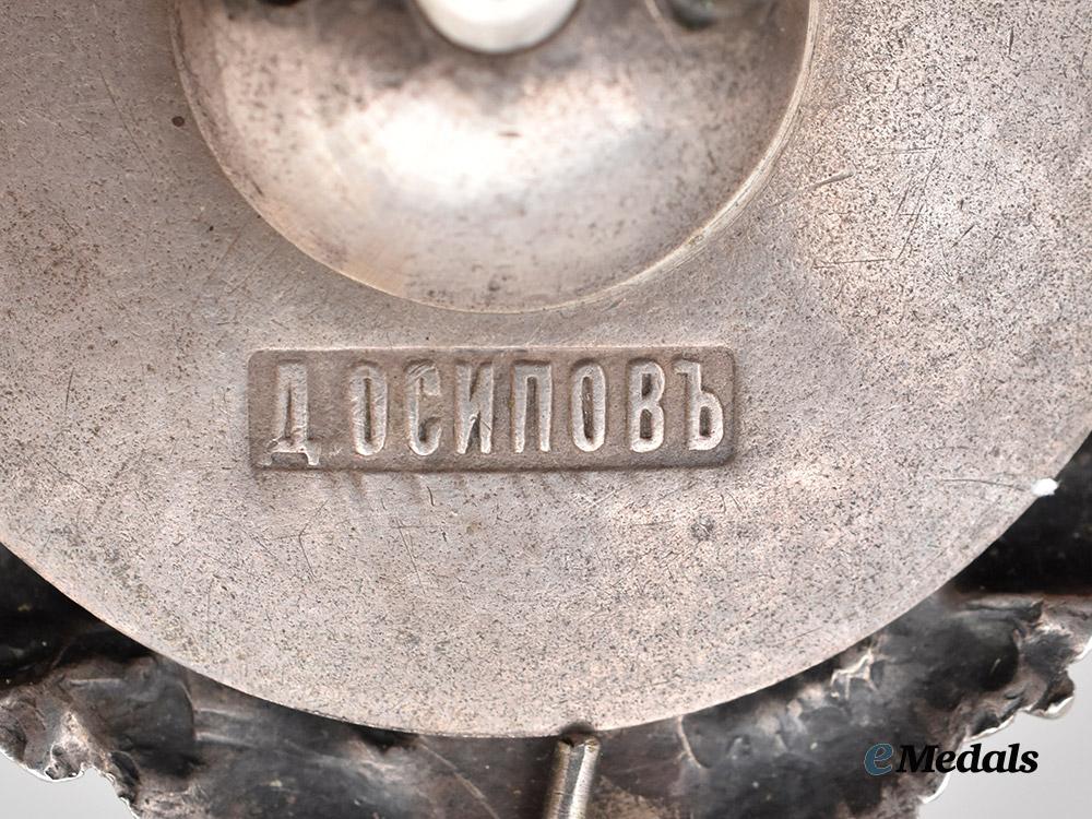 Instituted January 9, 1914. In silver, silver gilt, and green enamels, presenting an ovular wreath with green enamel center featuring the silver gilt superimposed cyphers of Alexander II and Nicholas II, with the dates below 1864 1914, the reverse bears a single vertical screwpost with backplate and closure (featuring two integral loops), marked with Dmitry Osipov maker mark on screwplate and badge reverse, also marked with 84 kokoshnik, denoting silver fineness, measures 41mm (w) x 66.5 mm (h), weighs 38.3 grams, enamels intact, light wear, a rare badge in extremely fine condition.
