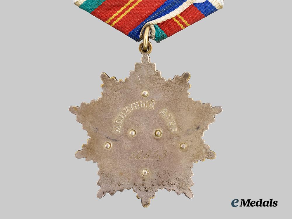 (oрден Дружбы народов). Instituted in 1972. Four-piece construction, in silver gilt with red, white, green and light blue enamels, maker marked "МОНЕТНЫЙ ДВОР" (Monetny Dvor) and number engraved "12963" on the reverse, measuring 47 mm (w) x 51 mm (h) inclusive of its integral ring, intact enamels, light contact marks evident on the reverse, original ribbon, mounted to a five-sided aluminum suspension with pinback, extremely fine.