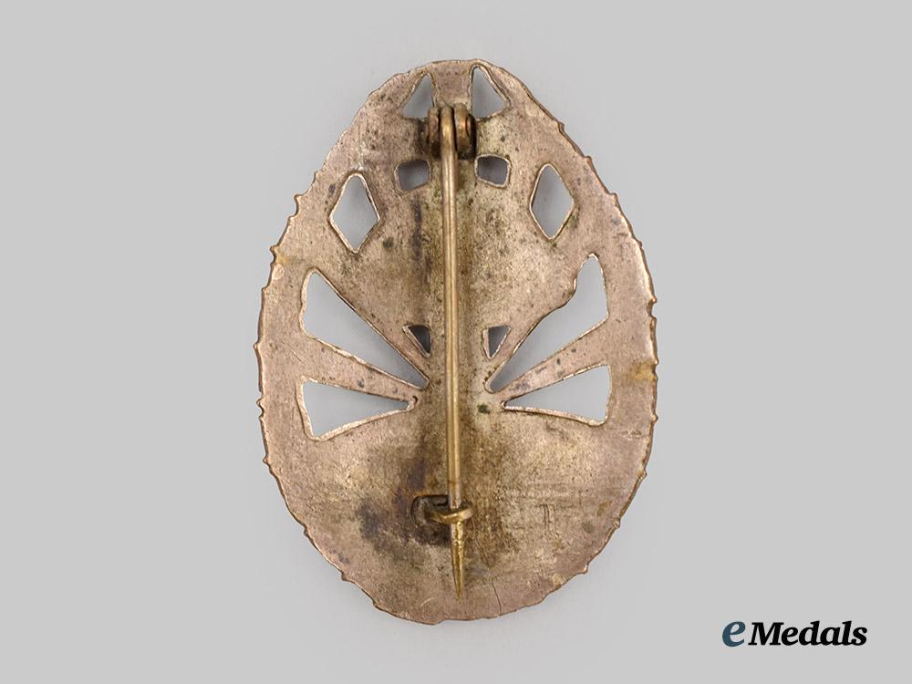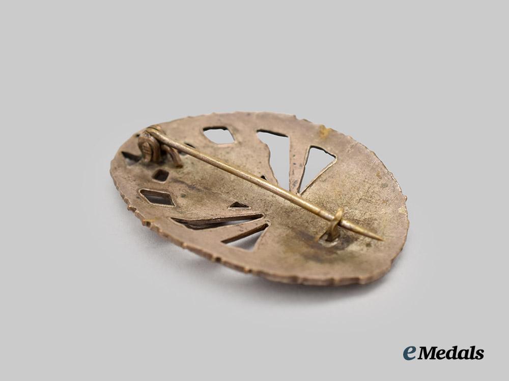 Constructed of silvered bronze, the obverse consists of an oval laurel leaf wreath, surrounding a central sword overlaid by an M32 helmet, the latter bearing a Slovak Cross situated above a date of “22. VI. 1941”, with the tip of the sword plunging into a fractured five-pointed star and stickle and hammer, situated against a backdrop of stylized rays, the reverse with a clip and vertical pinback meeting a flat wire catch, unmarked, measuring 33.1mm (w) x 46.8 mm (h), in extremely fine condition.