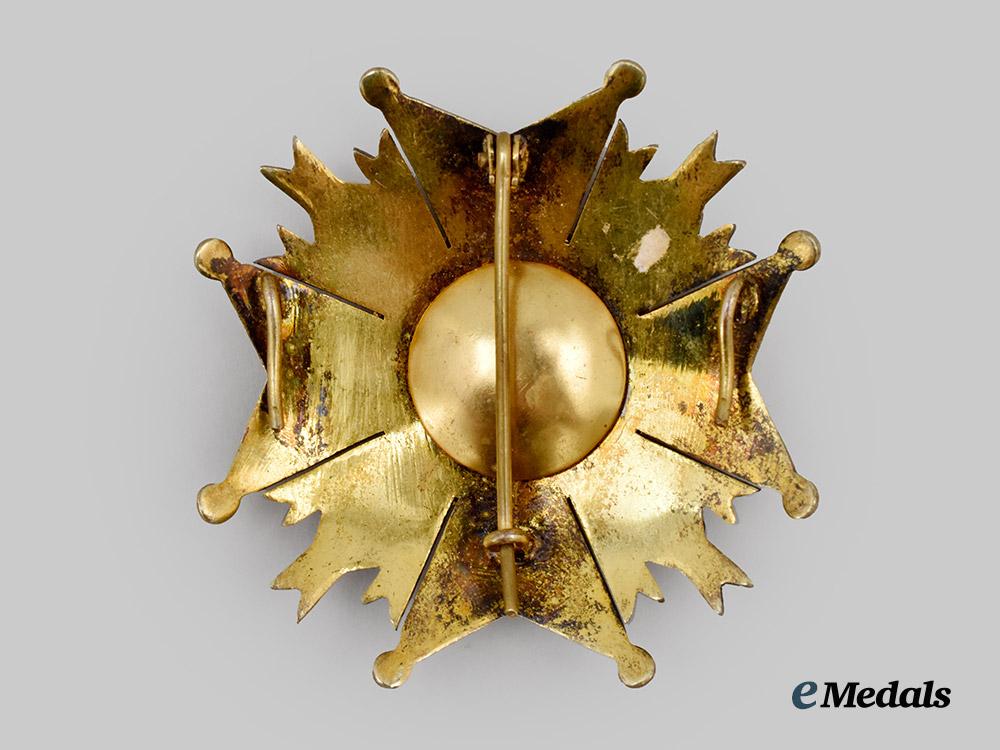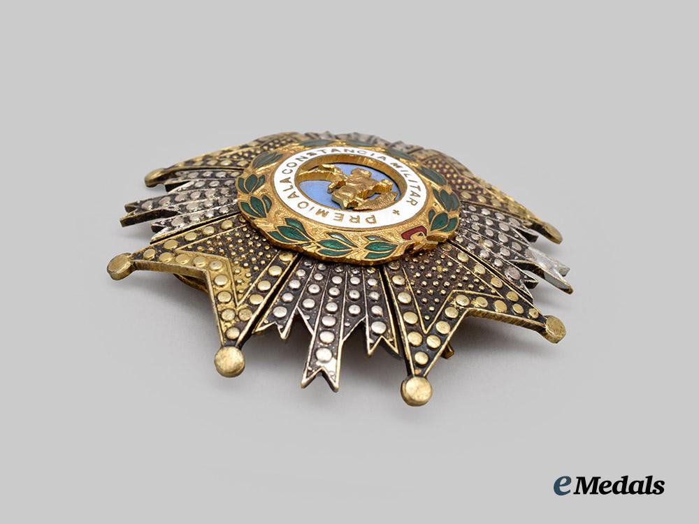 An Order of St. Hermenegildo, Commander by Number, in silver gilt and enamels, vertical pin flanked by dual stays on the reverse, measures 64 mm (w) x 63.5 mm (h), enamels intact, gilt wear evident, loss of silver finish, remains very fine.