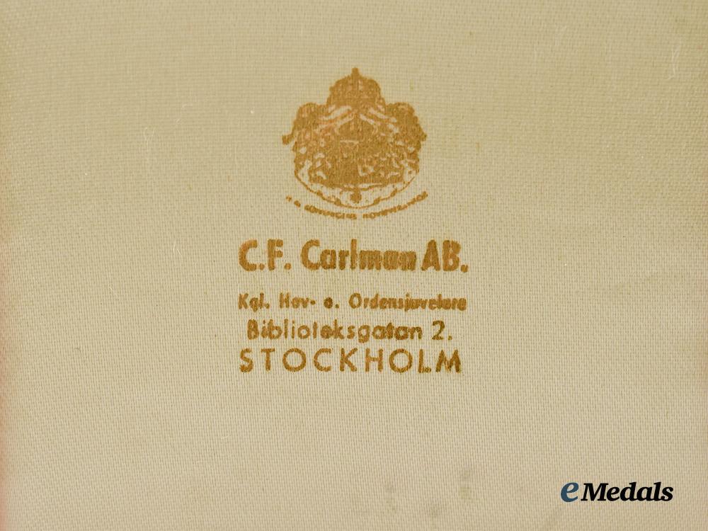 Contained in the original case of issue, a red leatherette exterior with gilt details, the interior with a silk lid and velvet medalbed, marked C.F Carlman STOCKHOLM in the lid, measures 90 mm (w) x 130 mm (h) x 32 mm (d), light wear to exterior, very fine. Accompanied by a small boutonniere of the order denoting Commander class.