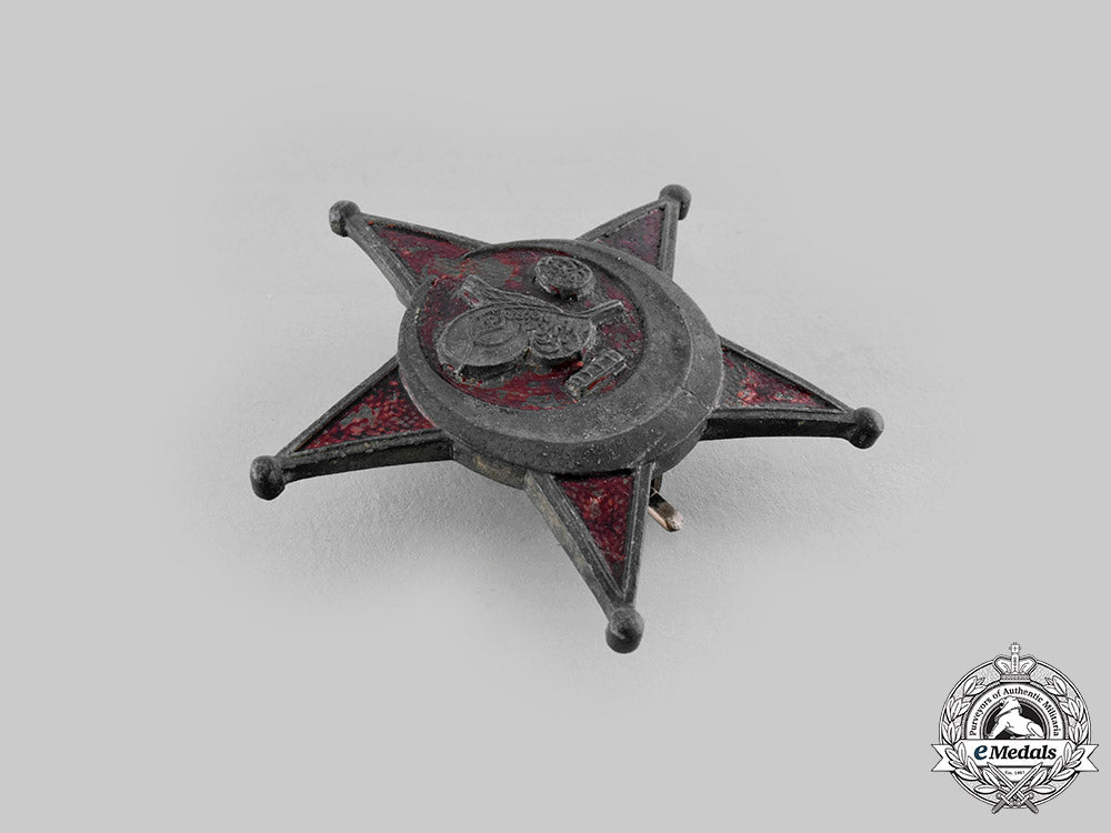 (Harp Madalyası). Instituted in 1915. Four-piece construction, in silvered zinc with red patination, measuring 56.7 mm (w) x 53.3 mm (h), vertical pinback, overall silvering loss, scattered wear in the red patination, surface wear, better than fine.