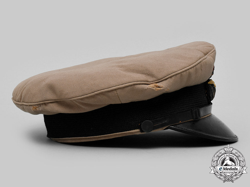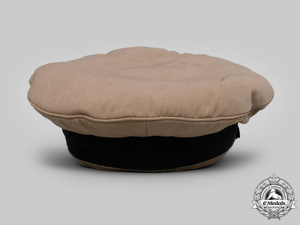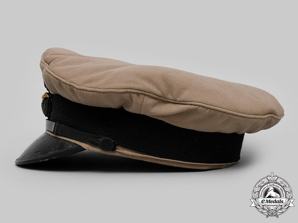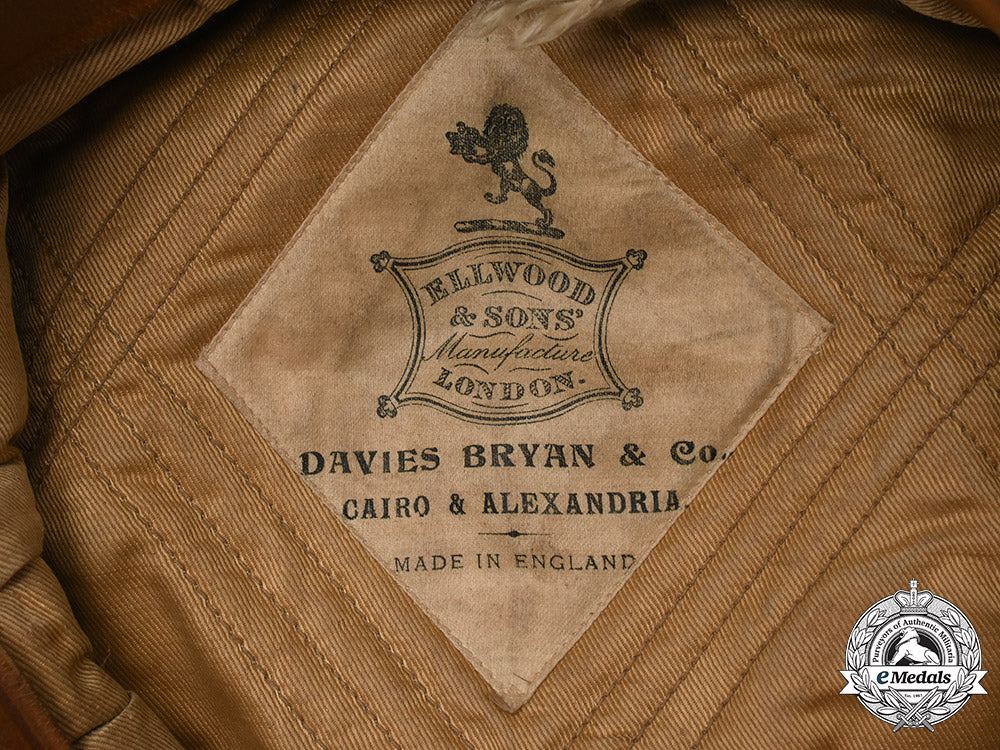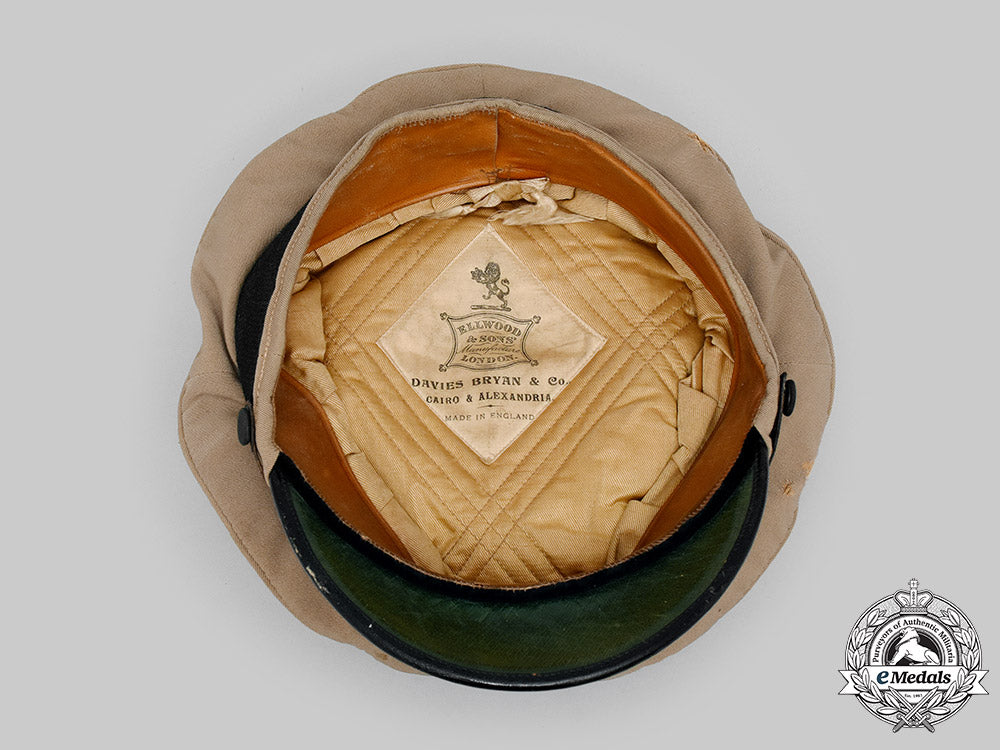 This cap started out life as an Royal Naval Air Service cap and was subsequently used for early Royal Air Force duties. This fine quality peaked cap is fabricated from a khaki wool on the exterior, featuring the classic high peak. It has a 35 mm wide black band around its circumference, which supports the Royal Air Force insignia at the front. The insignia is composed of a gilt metal eagle, the open-ended wreath and King's crown in silver and gold-coloured bullion wire, maroon felt accent in the crown, along with touches of red, green and blue embroidery in the crown's base, on a padded black wool base, the insignia measuring 55 mm (w) x 65 mm (h). The stiff visor is covered in a black patent leather, with reinforced stitching along the edge and has a black patent leather strap with dual adjustable rectangular sliders that runs across the front between the black fabric posts on either side. The underside of the cap is in a forest green synthetic material. The 43 mm wide tan sweatband is leather, with the two ends sewn together with a white ribbon, in a bow-tied fashion at the rear and is named in handwritten black ink "B.H. Bryom." on the underside on the right side. The sidewalls are lined in a champagne-coloured rayon, with the dome itself lined in a champagne-coloured cotton, the fabric quilted and maker marked "ELLWOOD & SONS' Manufacture LONDON. / DAVIES BRYAN & Co. CAIRO & ALEXANDRIA. / MADE IN ENGLAND". Overall, the cap measures 250 mm in width x 265 mm in depth x 110 mm in height. It exhibits light soiling on the exterior, with gilt and silvering wear in the bullion on the RAF cap insignia, contact marks on the black patent visor and light crazing of it's green synthetic underside, along with light soiling and wear on the leather sweatband from active use. The stitching remains intact throughout. As worn.