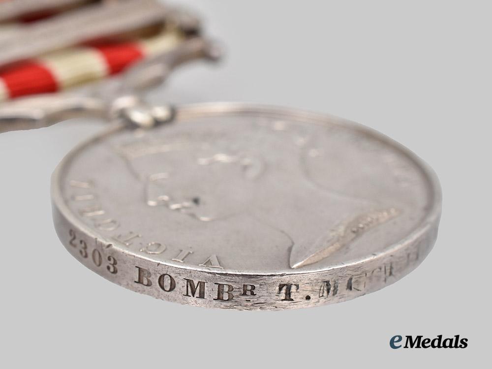 Instituted August 18 1858. In silver, full size, rim officially impressed 2303 BOMBR T. M[illegible] ‘E’ TP. R.H.A., with LUCKNOW and DEFENSE OF LUCKNOW clasps, rim is worn demonstrating a loss of the last name of the recipient, light contact and knocks to edges, bright, ribbon stained, near very fine.