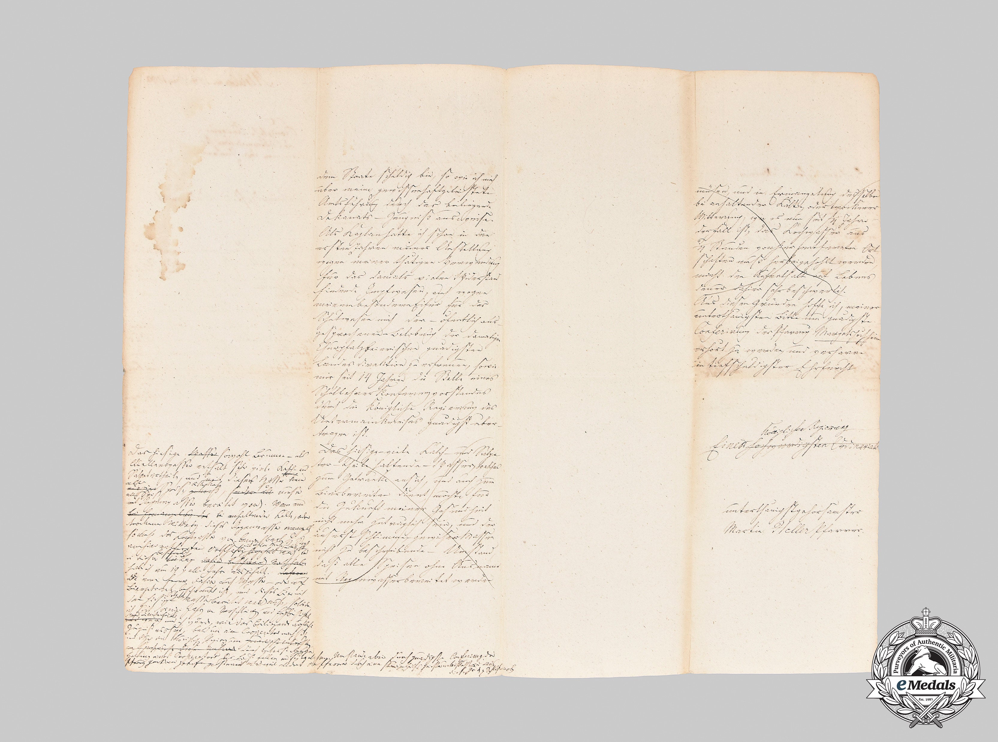 Documents measuring 212 mm (w) x 340 mm (h), each presenting folding crease, scuffing of the edges, and one with medium rip and cutout around wax stamp, remaining better than very fine and better than fine, respectively.