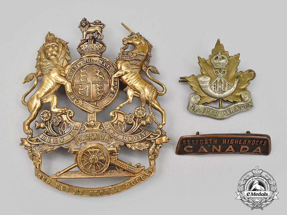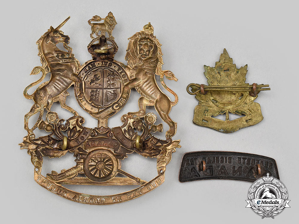 1. Royal Canadian Artillery Helmet Plate c. 1910: in die-stamped bronze gilt, voided, unmarked, measuring 87 mm (w) x 105 mm (h), all three lugs intact (the design of this badge is illustrated on page 15 of "Canadian Militia Badges Pre 1914" by Daniel Mazeas (HP.23.).