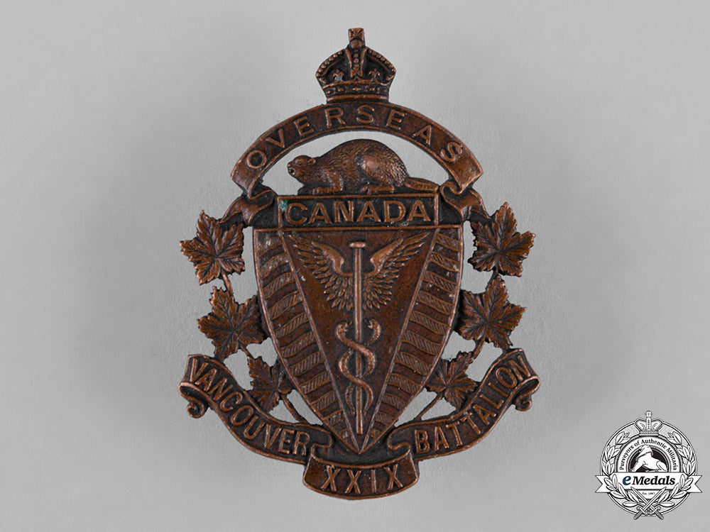 Version two with "VANCOUVER XXIX BATTALION" ribbon banner. In browning copper, unmarked but known to have been manufactured by the Goldsmiths and Silversmiths Company Limited of London, England, measuring 32.3 mm (w) x 42.5 mm (h), both lugs intact, extremely fine.