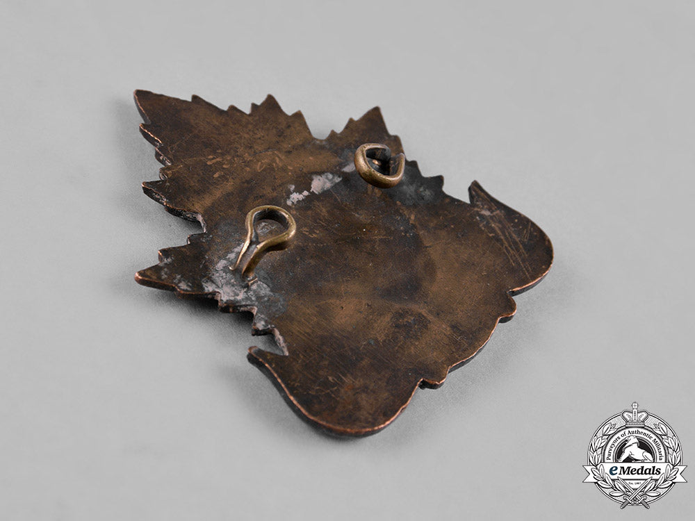 Insignia and ribbon banner in silver, the maple leaf and crown in silver gilt, mounted to a browning brass plate, measuring 41 mm (w) x 48 mm (h), both lugs bent back but intact, light contact, near extremely fine.